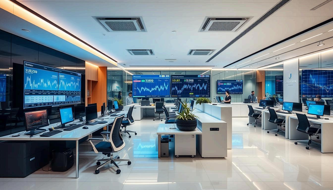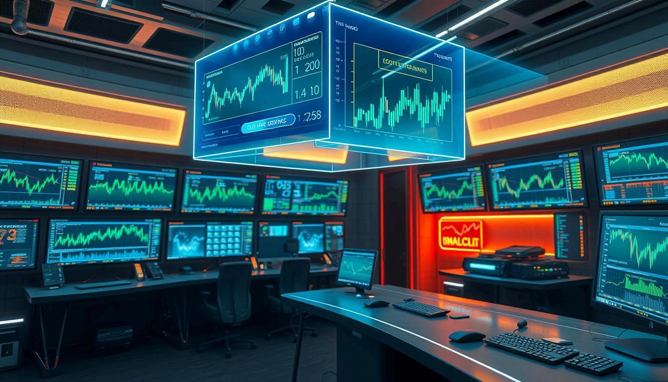 A futuristic trading room filled with sleek, high-tech devices and screens displaying fluctuating stock graphs, digital currencies, and market data. A holographic interface with interactive charts and analytics floats above the control desk, illuminated by soft blue and green lights. The atmosphere is dynamic, reflecting a fast-paced financial environment with vibrant colors and modern design elements.