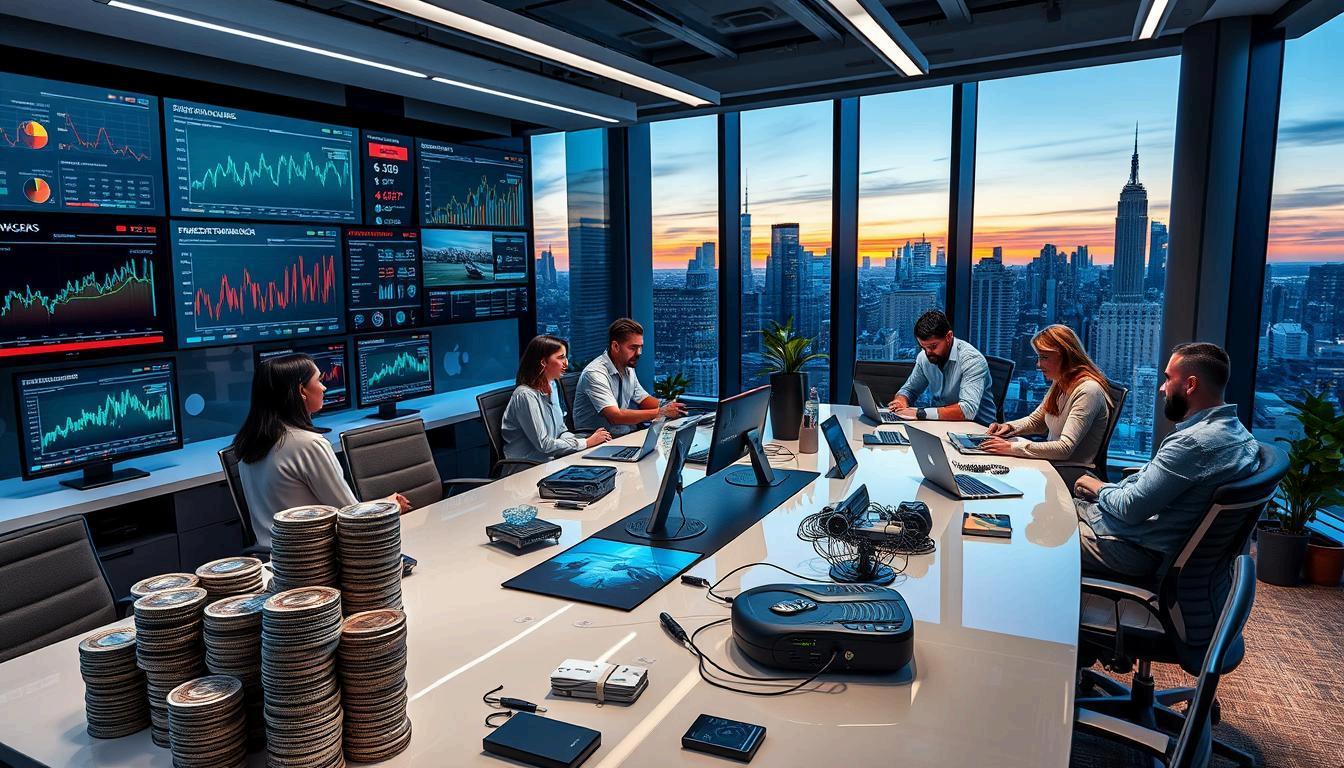 A modern office space filled with sleek financial technology displays, stacks of digital currency, data graphs and charts on screens, diverse professionals analyzing financial data, a polished conference table with futuristic gadgets, and large windows overlooking a city skyline at dusk.