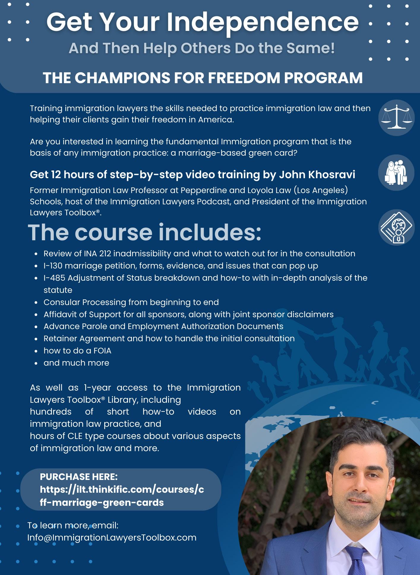 John Khosravi is the Managing Attorney of the JQK Law Firm, a boutique-style Immigration Law frm. He is also the President of the Immigration Lawyers Toolbox®, an education and media company focused on immigration law, including the only Immigration Lawyers Toolbox® Magazine, Podcast and Post-Graduate Workshops. He is also a former Professor of Immigration Law at Pepperdine and Loyola Law Schools.