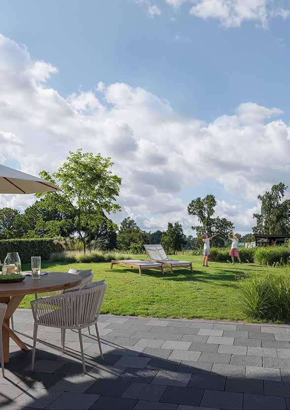 • Opritten, paadjes en terrassen in waterdoorlatende genuanceerde betonklinkers, formaat 20/20 tussen boordstenen.