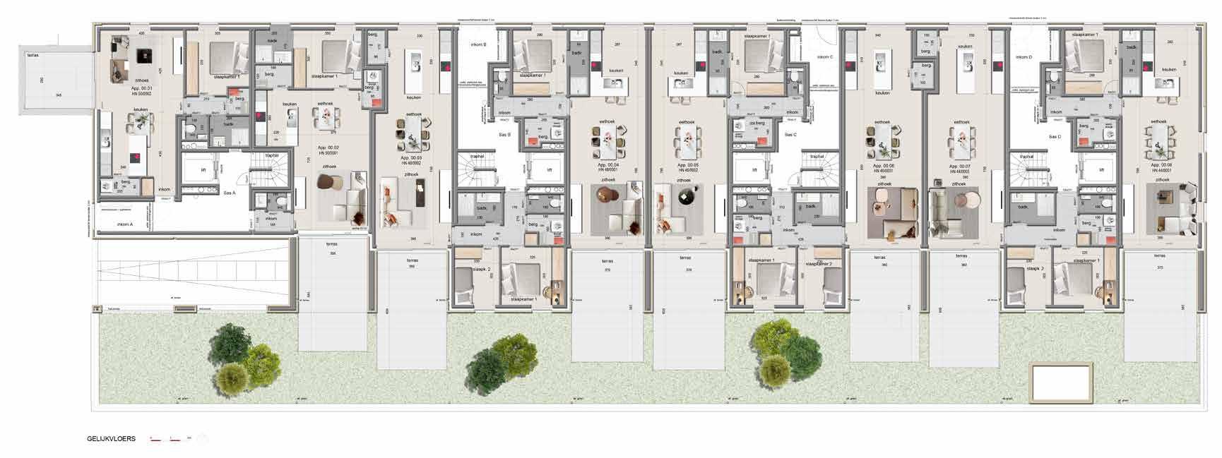 • Vloeren gemeenschappelijke delen, uitgezonderd de kelder, worden bepaald door Bouwkantoor Danneels.