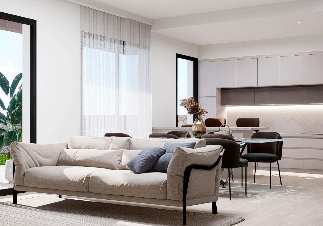 La cocina se proyecta con un diseño moderno y funcional, integrada en el espacio del salón-comedor. El mobiliario presenta frentes lisos con sistema de tiradores ocultos.