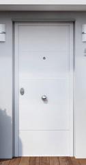 De conception moderne, laquée en blanc, blindée, à une feuille, avec 3 points de fermeture. Serrure de sécurité encastrée avec un bouclier anti-perçage à l'extérieur Avec poignée, manivelle et judas