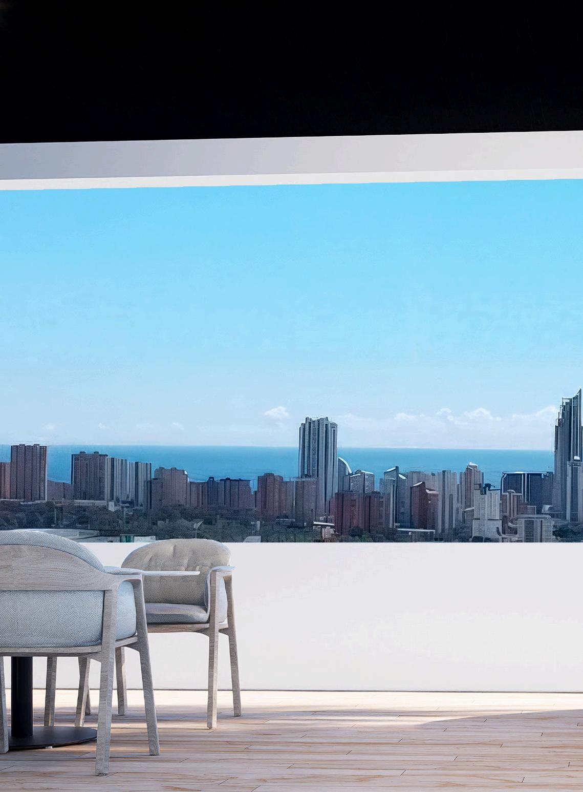 Menuiserie en aluminium laqué noir avec rupture de pont thermique. Double vitrage. Système d’occultation dans les chambres au moyen de volets roulants assortis à la menuiserie aluminium, avec coffre de volet isolé.