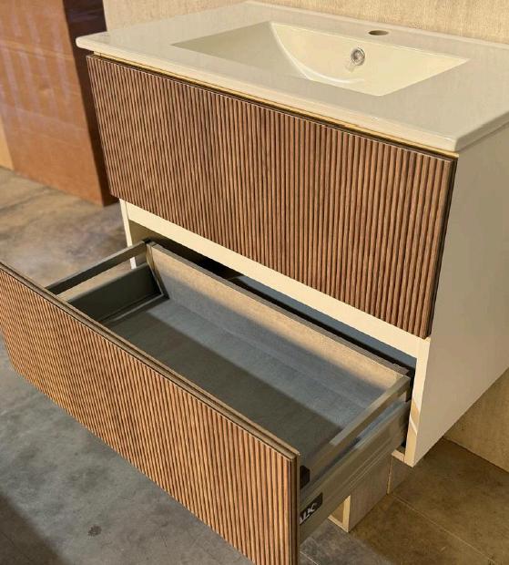 Meuble avec façade Dakota foncé et côtés en blanc mat. Guides Ducati dans les tiroirs et plan de travail en céramique encastré.