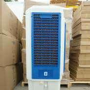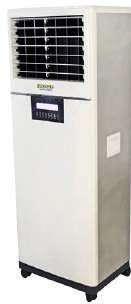 Una bomba hace circular el agua del depósito hasta un filtro especial que se humedece considerablemente. El nivel del agua se controla mediante un flotador. El líquido recircula dentro del enfriador, pero, al enfriar el aire, se produce un proceso de evaporación, por lo tanto, el agua se va consumiendo. El enfriamiento es directamente proporcional al agua evaporada o consumida. La turbina o ventilador, absorbe el aire caliente del exterior y lo canaliza a través del filtro