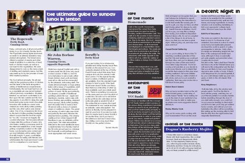 Restaurant of the month YO! Sushi For those not familiar with the concept of YO! Sushi, here’s a brief overview of the unique dining experience it provides. There’s no need to book, just turn up and you’ll be seated pretty promptly. If you’re not lucky enough to get a booth, sit along the bar where you’ll find all the accompaniments to cater to your sushi needs: soy sauce, wasabi and pickled ginger. Dishes wizz around on a conveyor belt and are colour-coded according to their price. Don’t go too crazy grabbing things off the belt though, there’s an extensive menu which you can order from – press the red button and a waitress will come over. For a small price you can have as much miso soup, water or green tea as you want; a good tactic is to fill your stomach with these if you don’t want to spend too much money. Here are a few dishes we strongly recommend though: pumpkin korroke, crunchy prawn ISO, crispy duck & moromi miso hand roll, edamame beans. It’s much more than just sushi.