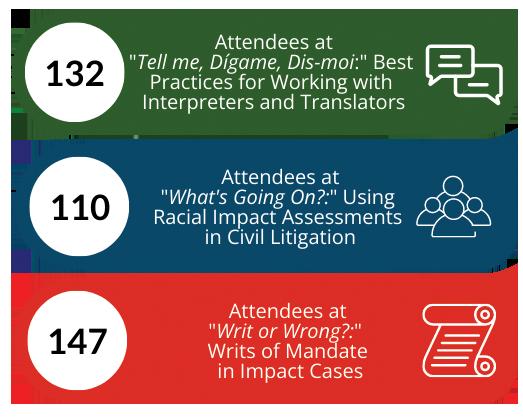 IT WAS AN EXCEPTIONAL YEAR, with record participation in our trainings from advocates at Qualified Legal Service Providers (legal aid nonprofits funded in part by the State Bar of California), private firms, and nonprofits around the nation. This year, the training team took multiple steps to enhance the accessibility of our programs. For each of our summer webinars, we provided both Communication Access Real-time Translation (CART) captioning and American Sign Language (ASL) interpretation. Additionally, we conducted demographic surveys at every training to better understand our reach and identify any communities we may be missing. The team also led an Effective Legal Writing training specifically for law fellows and clerks working at Qualified Legal Service Provider programs and nonprofits across California.