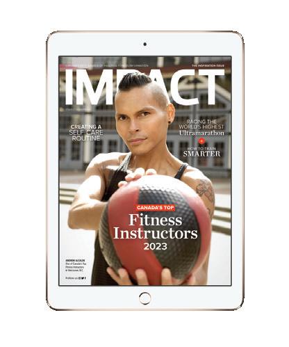 impactmagazine.ca CANADA’S BEST SOURCE OF HEALTH & FITNESS INFORMATION THE INSPIRATION ISSUE CANADA’S TOP Fitness Instructors 2023 HOW TO TRAIN SMARTER Follow us ANDREW ALCALDE One of Canada’s Top Fitness Instructors in Vancouver, B.C. RACING THE WORLD’S HIGHEST Ultramarathon CREATING A SELF-CARE ROUTINE