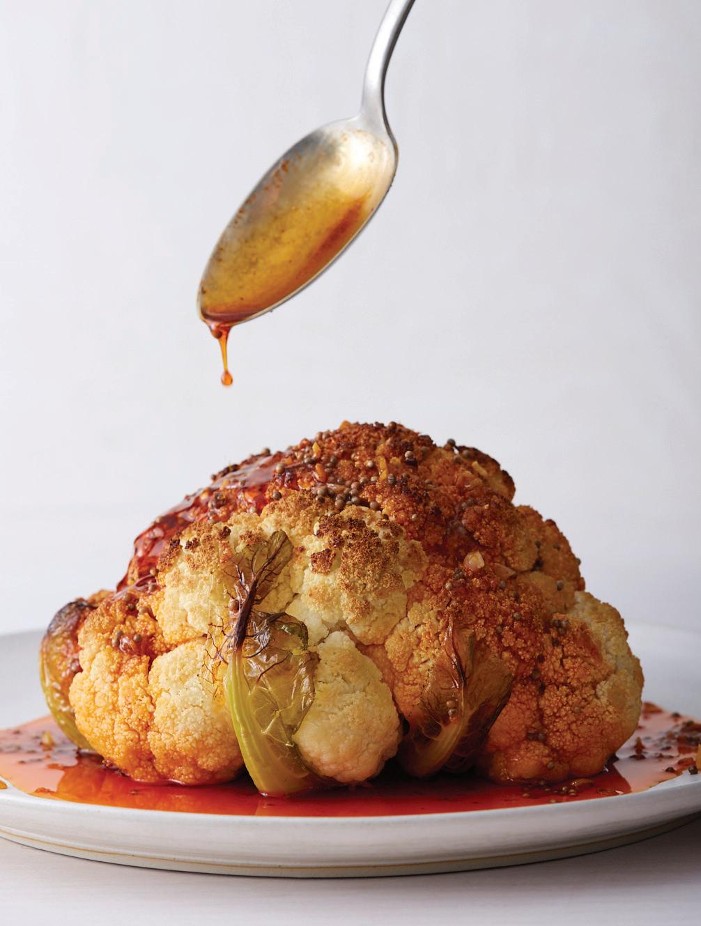 When the cauliflower is ready, carefully remove the skillet from the oven and let it cool a bit. Put the saucepan with the seasoned oil over medium- low heat to rewarm and squeeze in the lime; taste and adjust the seasoning. Quarter the cauliflower and open it up into wedges. Drizzle the oil over all and serve.