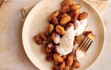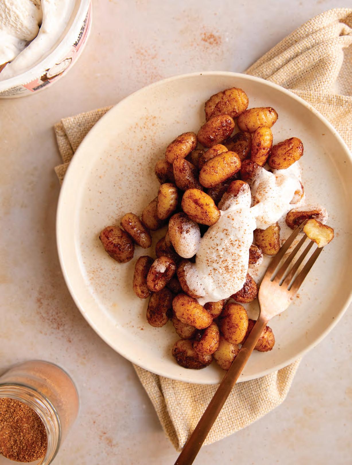 4. Add cinnamon sugar and toss to coat the gnocchi. Spread gnocchi into an even layer and cook another 1 to 2 minutes to allow the sugar to slightly caramelize. Lower heat to prevent burning. Turn off the heat and let the gnocchi rest for 1 minute as it will be very hot.