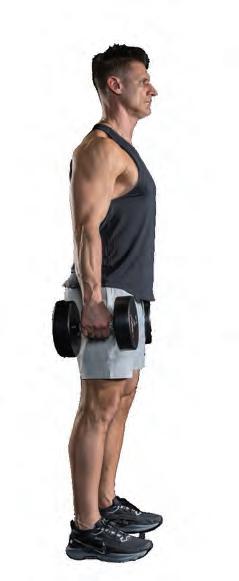 1. H old dumbbells at sides (arms long, relaxed like chains), shoulder blades together and down, maintaining scapular integrity. Stand tall/long through the torso, imagine standing at attention.