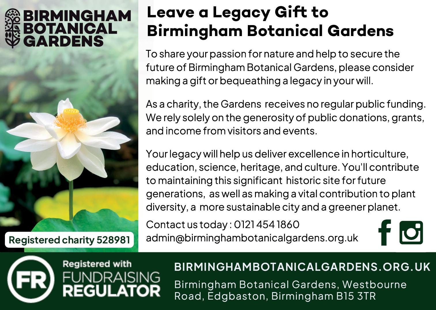 To share your passion for nature and help to secure the future of Birmingham Botanical Gardens, please consider making a gift or bequeathing a legacy in your will.