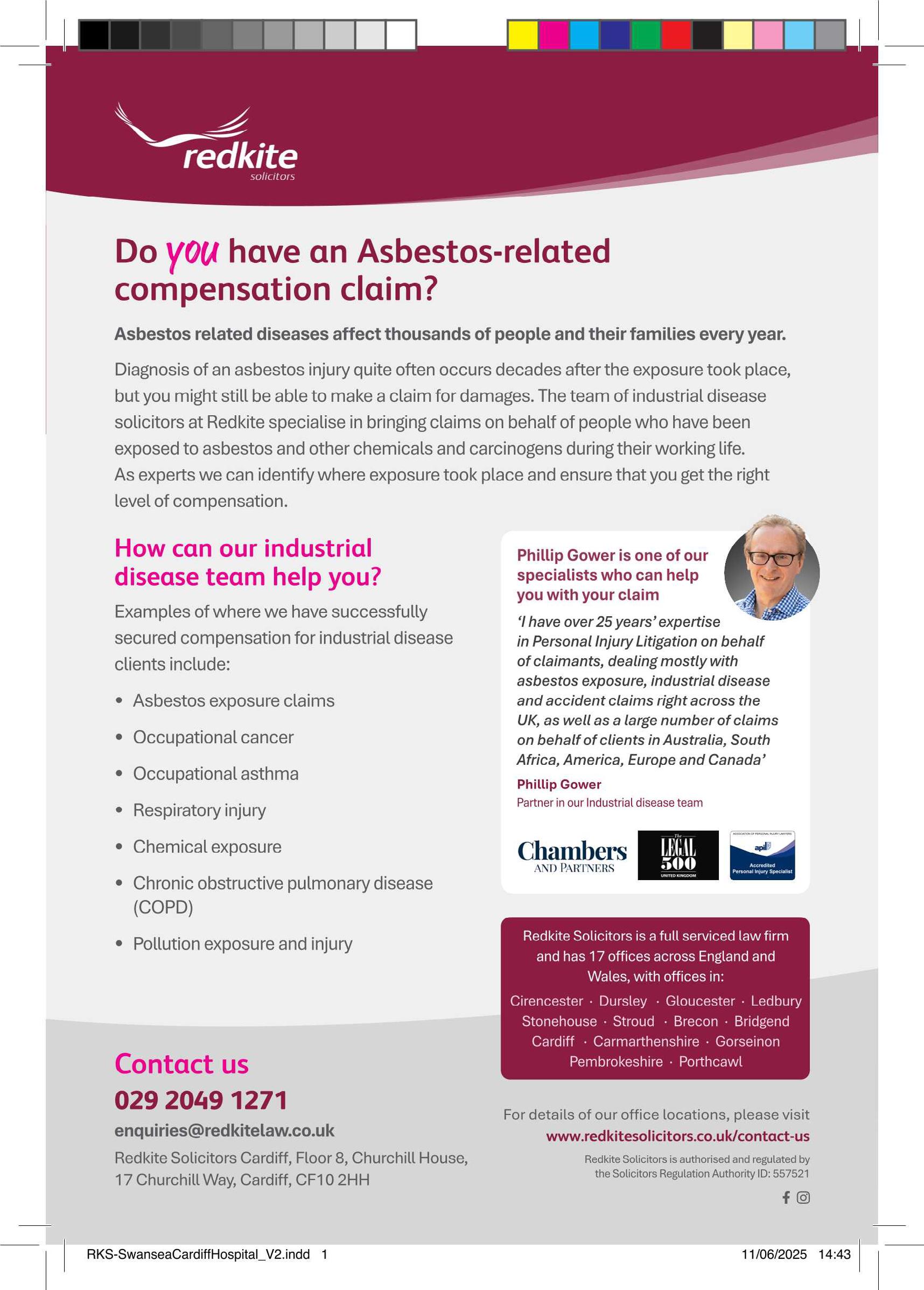 These sorts of claims can be quite complicated and require an experienced specialist. The Association of Personal Injury Lawyers maintain the only nationally recognised list of accredited Occupational Disease and Asbestos Disease Specialists. (See www. apil.org.uk/injury-lawyers/ occupational-disease-lawyer. You can find there an accredited disease specialist in your area.