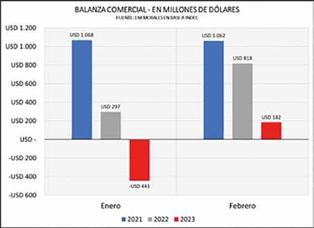 En el primer bimestre del 2021 el resultado superavitario de la balanza comercial alcanzó los USD 2130 millones, mientras que este año, para el mismo periodo, acumula un resultado negativo de USD 261 millones. Menos dólares implican más presión sobre el dólar oficial y más brecha cambiaria, pero también menos importaciones de insumos y bienes de capital (gráfico 4).