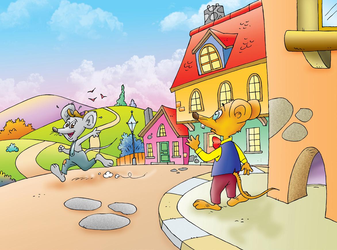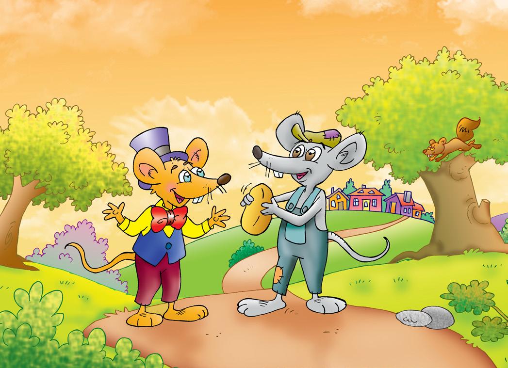 “My dear cousin, let me show you the wonders of the town,” says Town Mouse proudly.