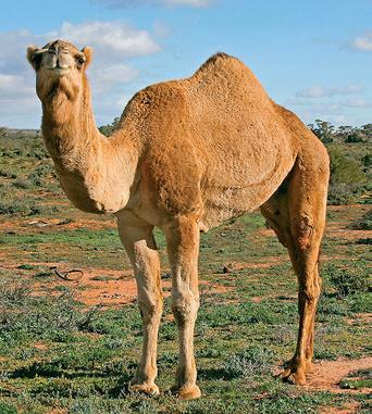 dromedary: A type of camel (a large animal that lives in the desert) with one hump (raised area) on its back.