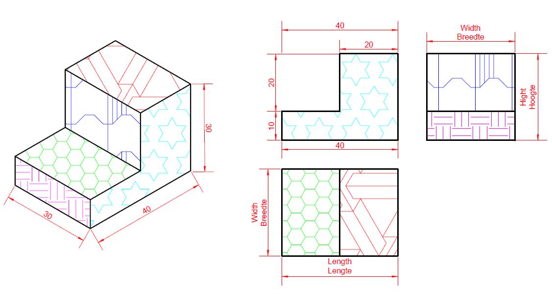 Die aansigte van ’n voorwerp in die eerstehoekse ortografiese projeksie. Eerstehoekse ortografiese projeksie is tweedimensionele tekeninge. Met ander woorde, dit is 2D, slegs twee dimensies (een aansig) word vertoon.
