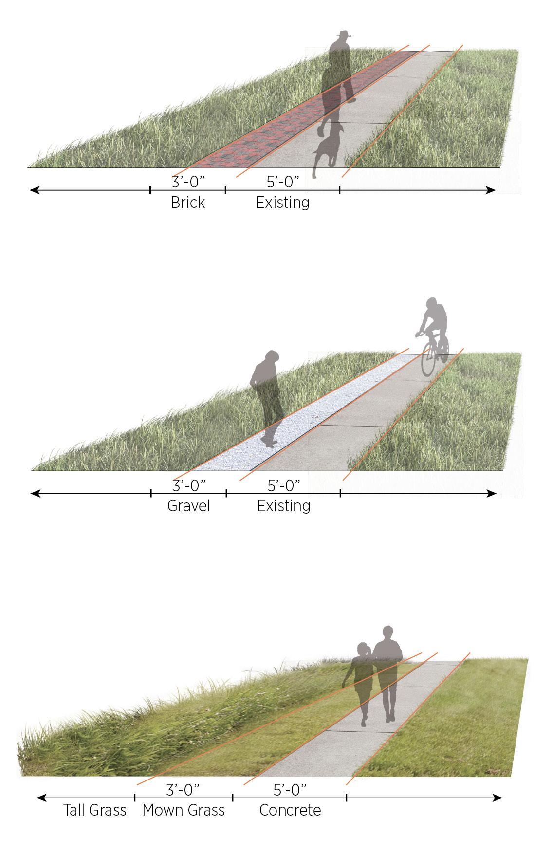 Much of the existing path system is preserved in the Vision Plan. However, there is a need to improve some of the existing pathways through path expansions as well as construct new pathways.