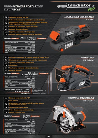 Indicador luminoso de conexión a la red eléctrica Empuñadura frontal y trasera con sistema Soft-Grip, mejor agarre y confortable a la mano Sistema de regulación rápida sin llaves Colector de polvo plástico Soporte para realizar trabajos fijos Permite realizar trabajos cerca de las orillas