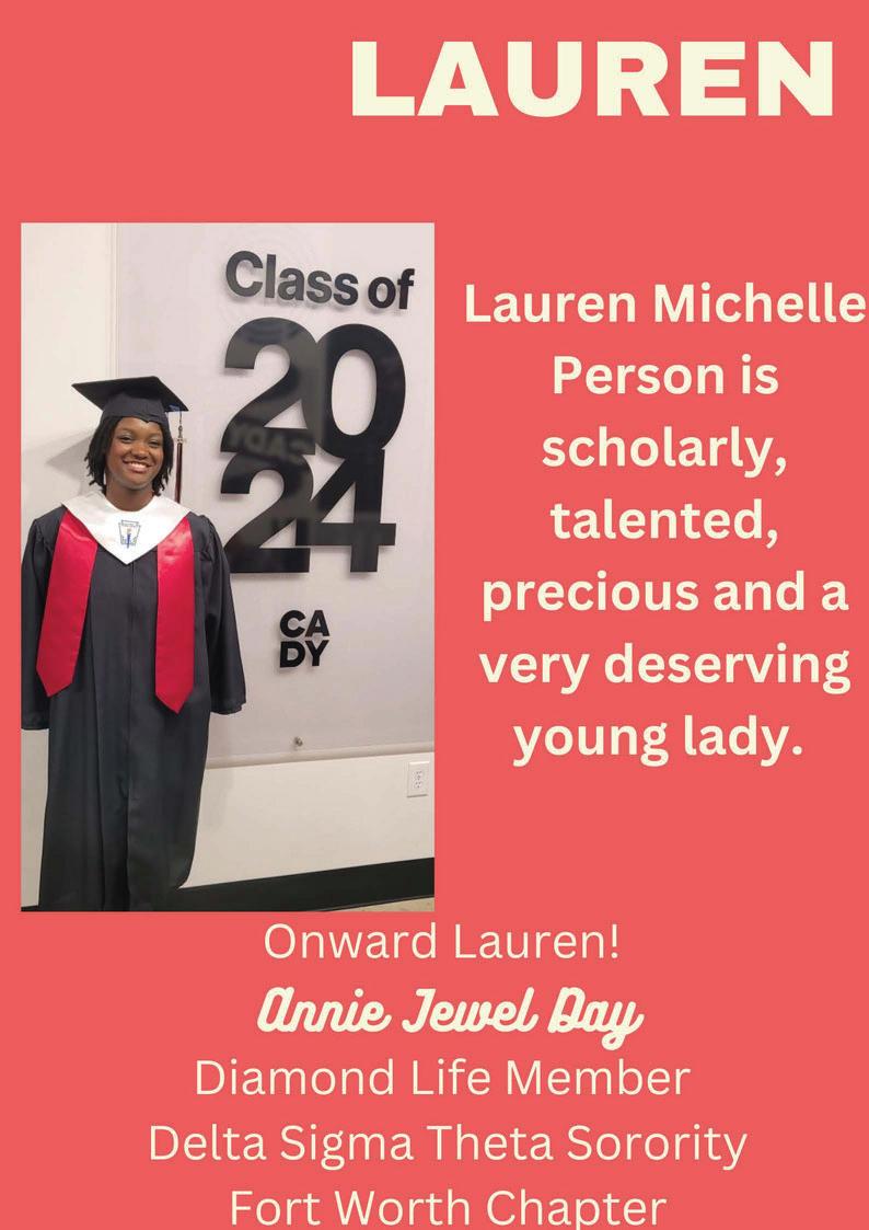 LaurenPerson, thedaughterofMarcandLeannSims-PersonofFort Worth,TX,isaseniorintheArlingtonISDSTEMAcademyatJames MartinHighSchoolinArlington,TX.WheresheholdsaweightedGPAof 4.07.Averybusyyoungscholar,indeed,Laurenisamemberofthe