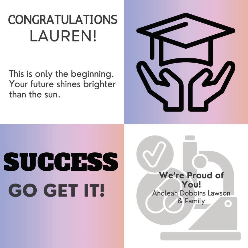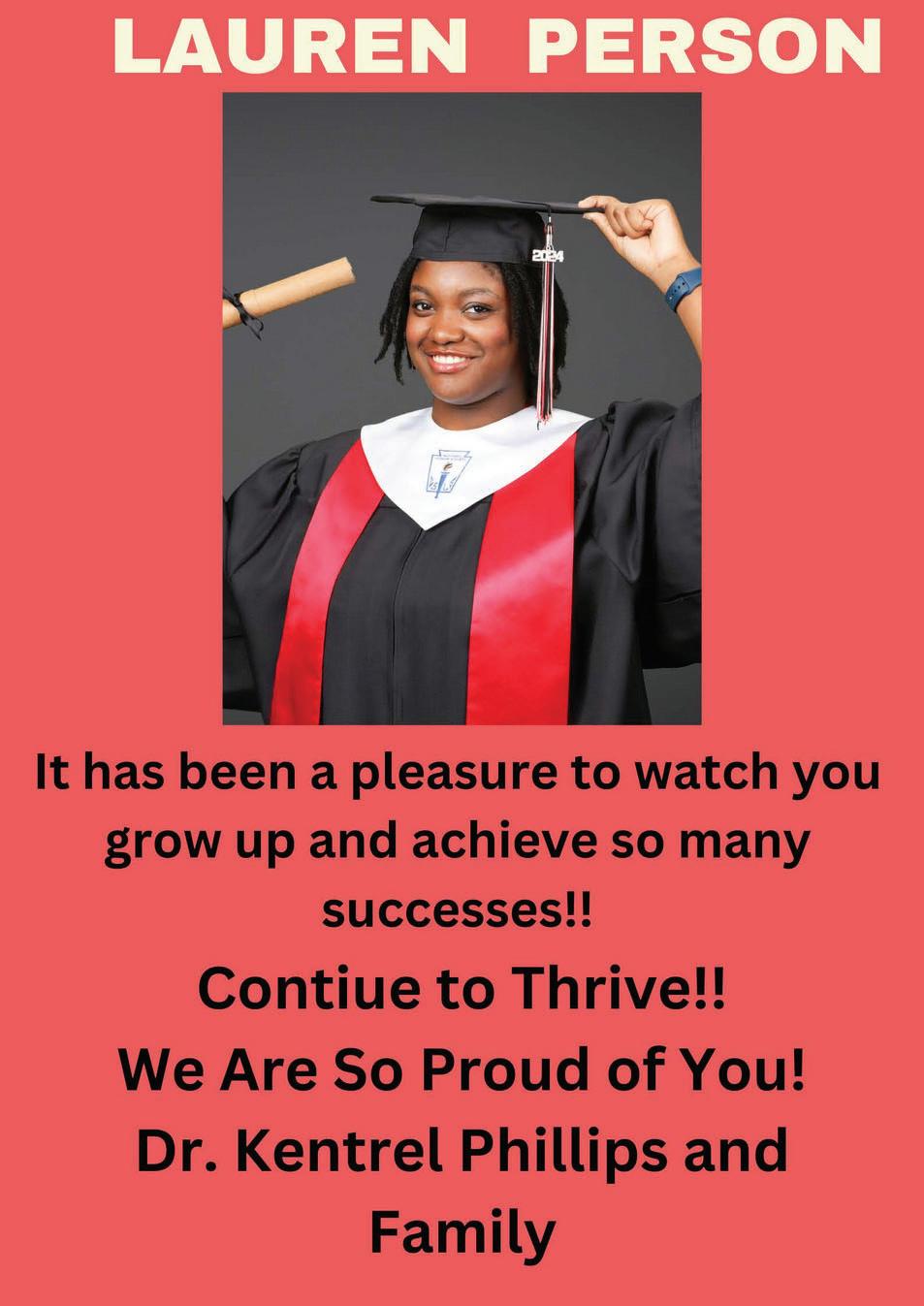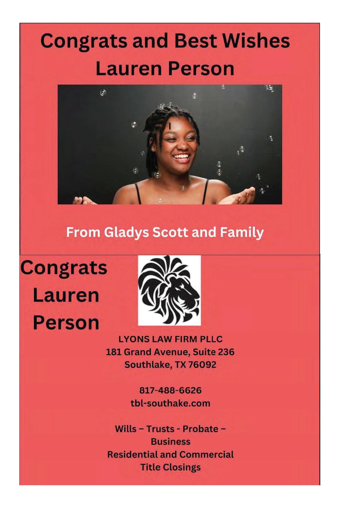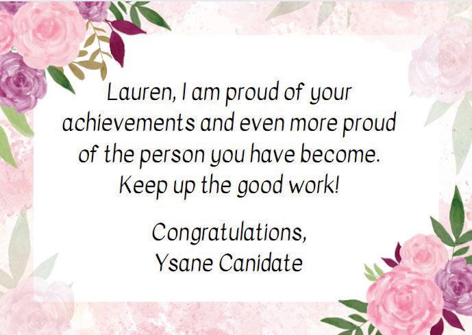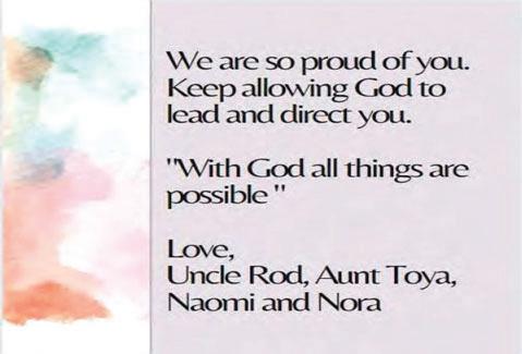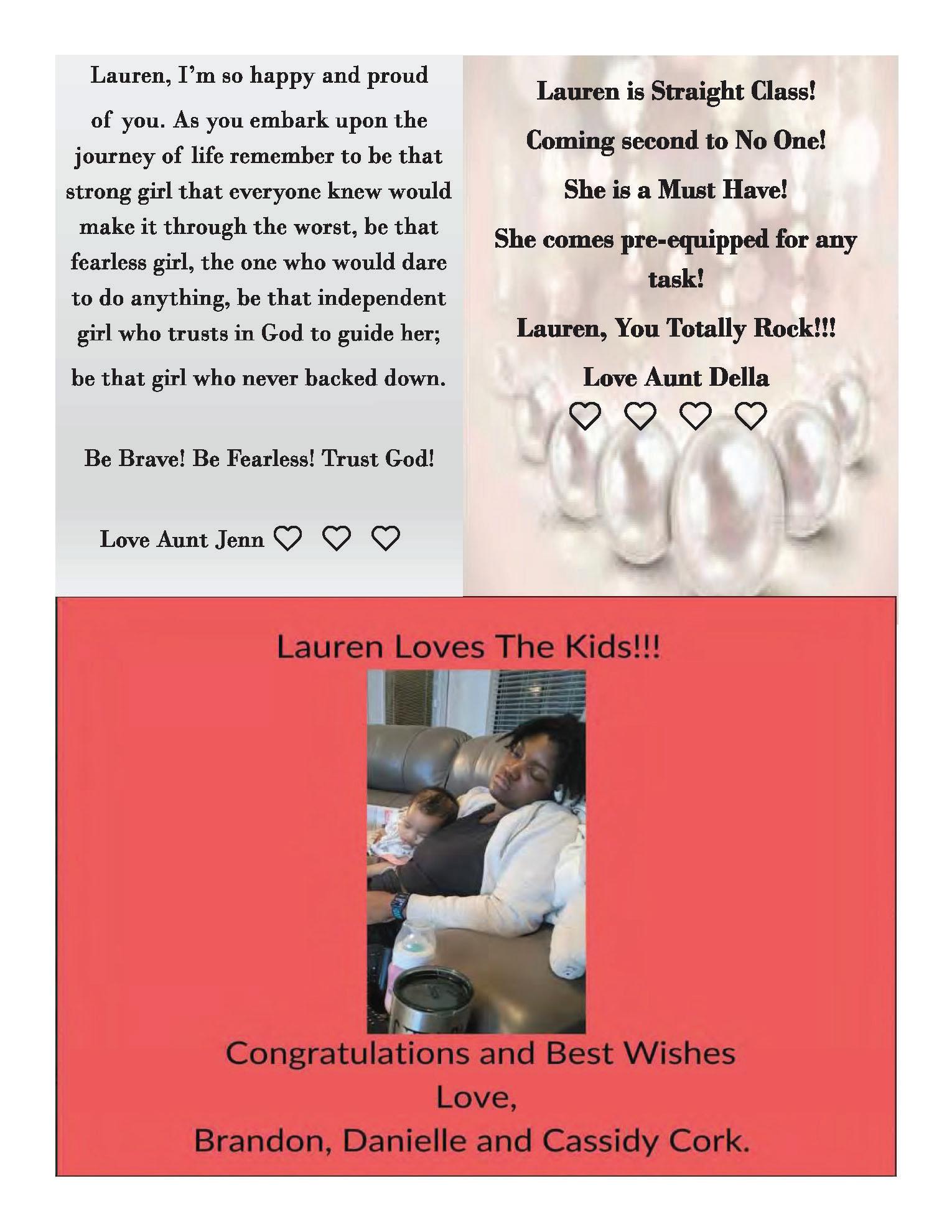 Lauren, Congratulations!Wearesoproudofyou!Graduationisnot theendofalongjourneybutthebeginningofabeautifulone. Starteachdaybelievinginyourself,andwatchthemagichappen! MayGod’sfavorfollowyoueverywhereyougo!