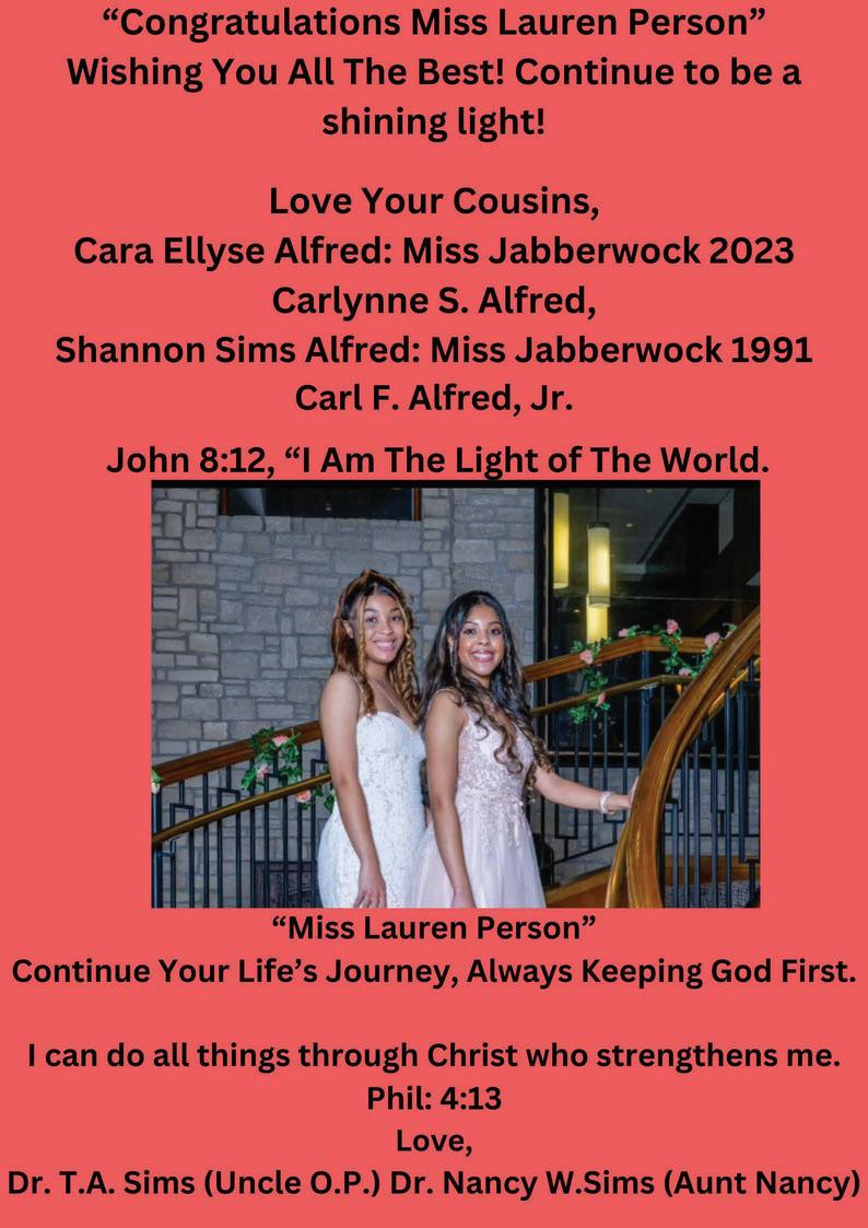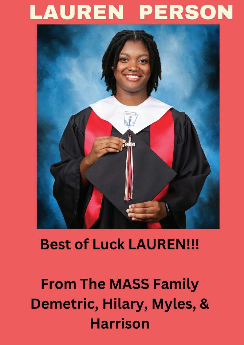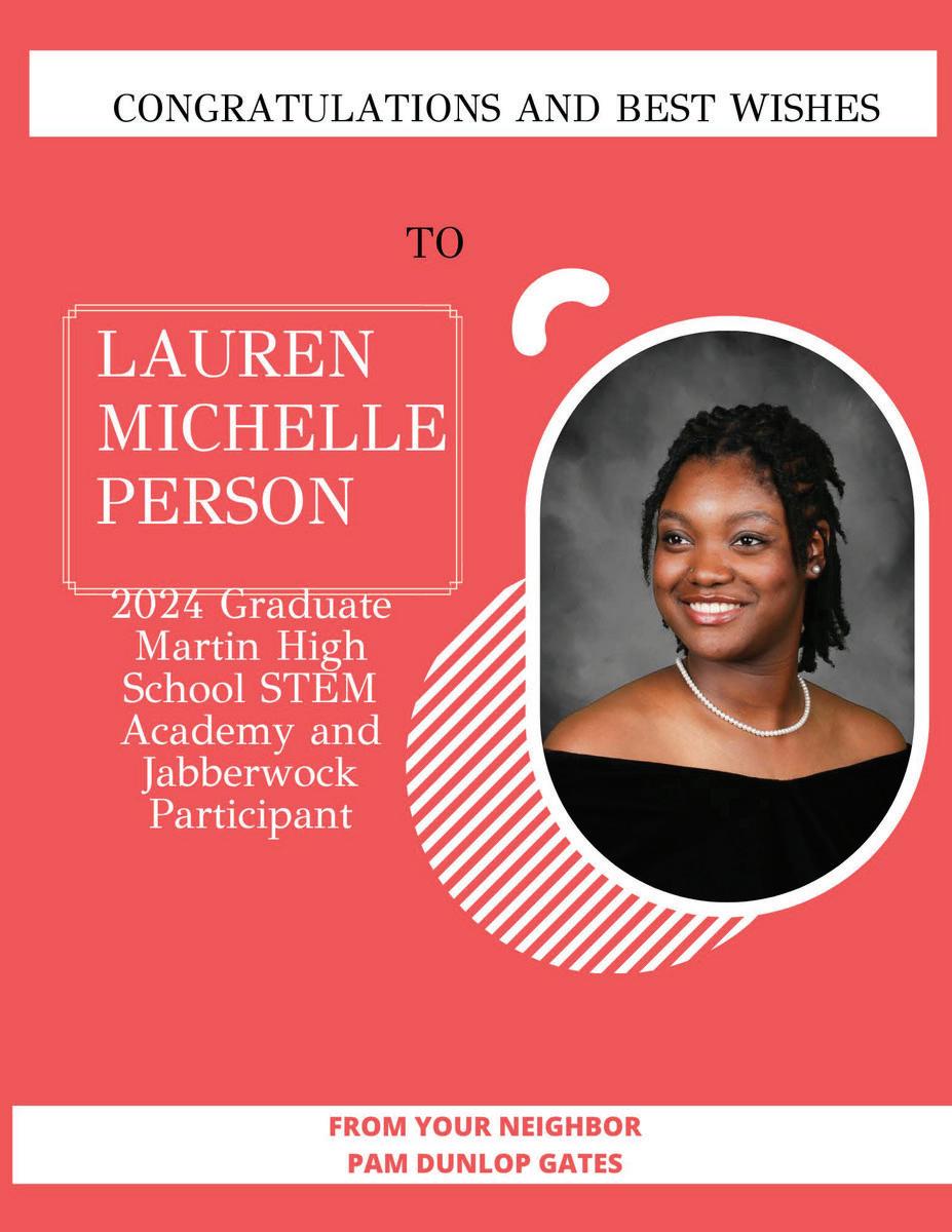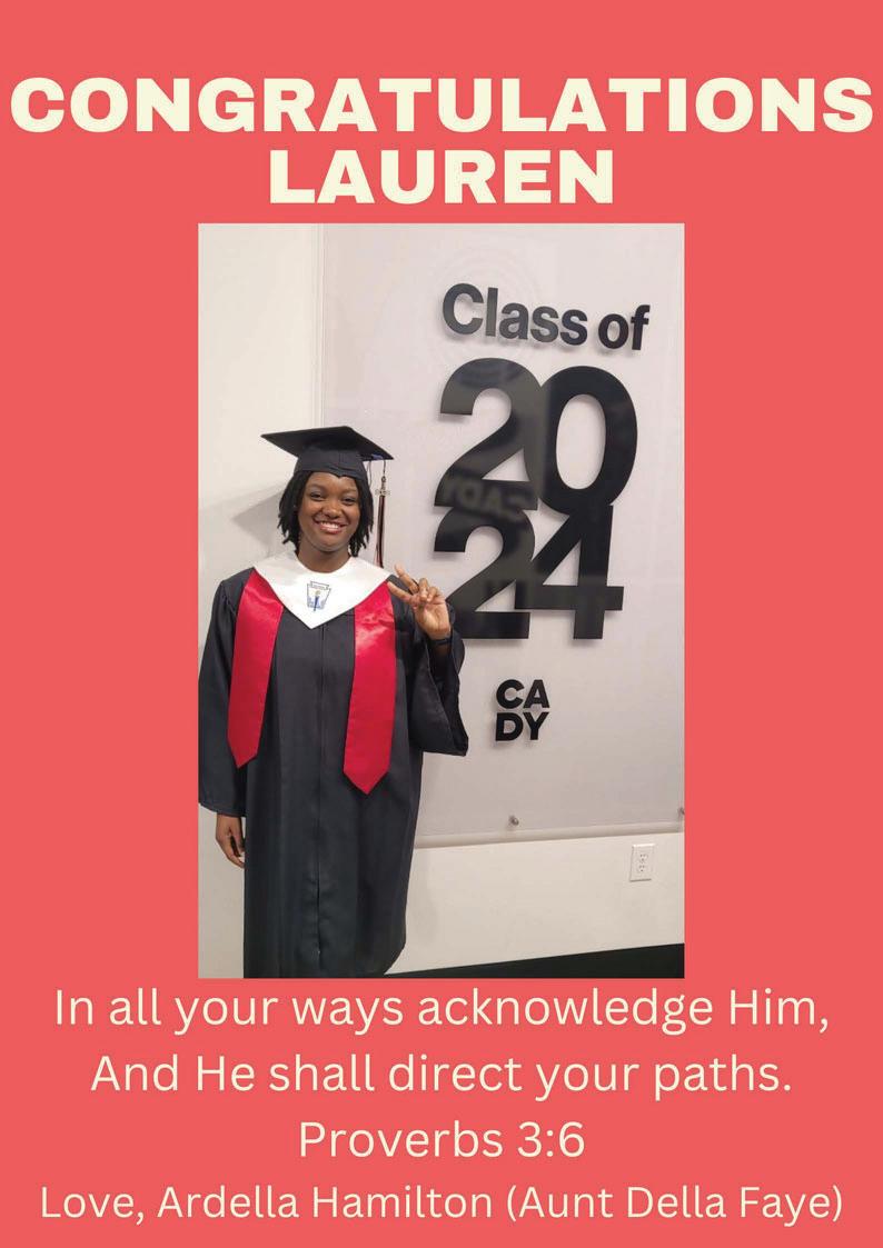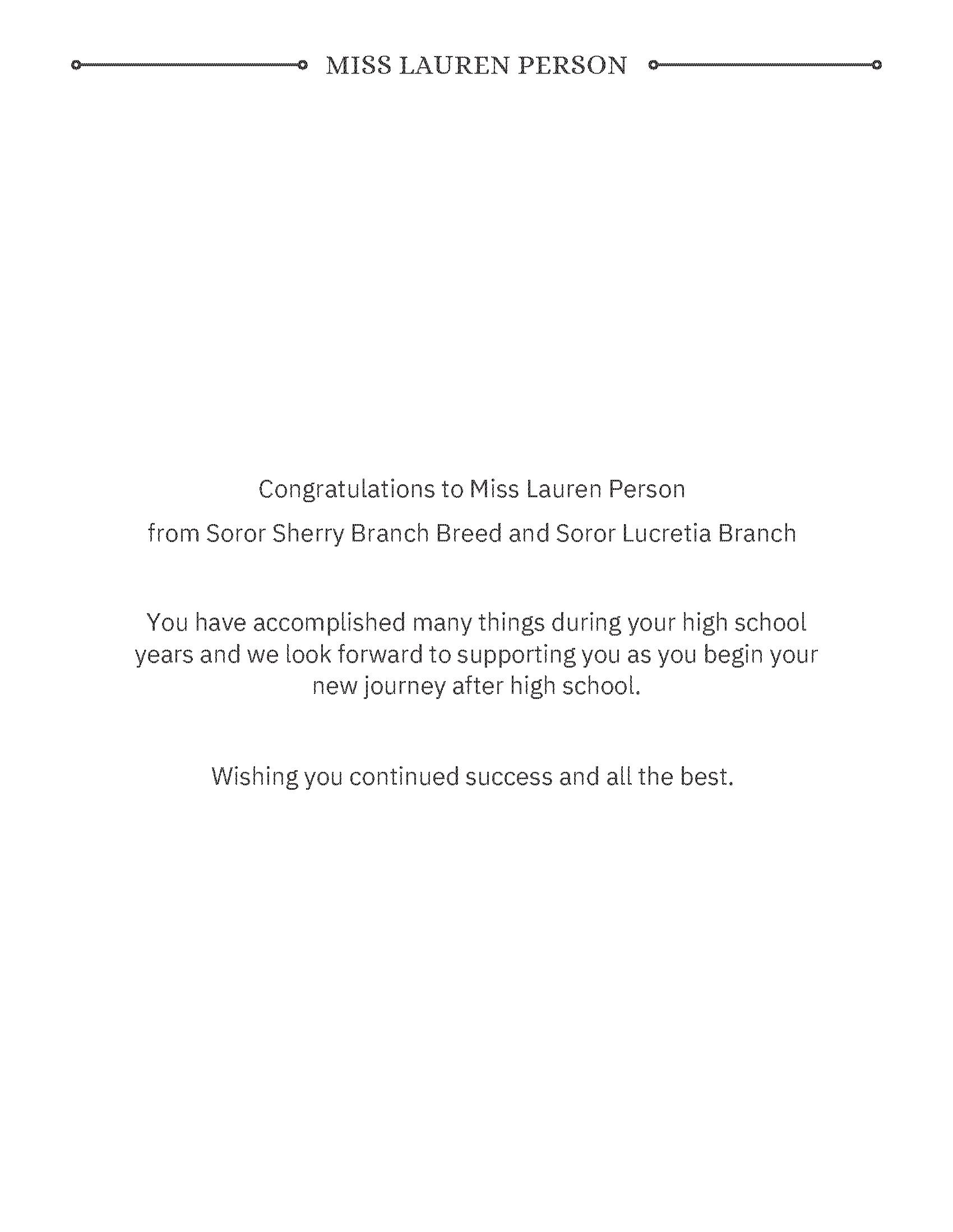 Lauren, Congratulations!Wearesoproudofyou!Graduationisnot theendofalongjourneybutthebeginningofabeautifulone. Starteachdaybelievinginyourself,andwatchthemagichappen! MayGod’sfavorfollowyoueverywhereyougo!