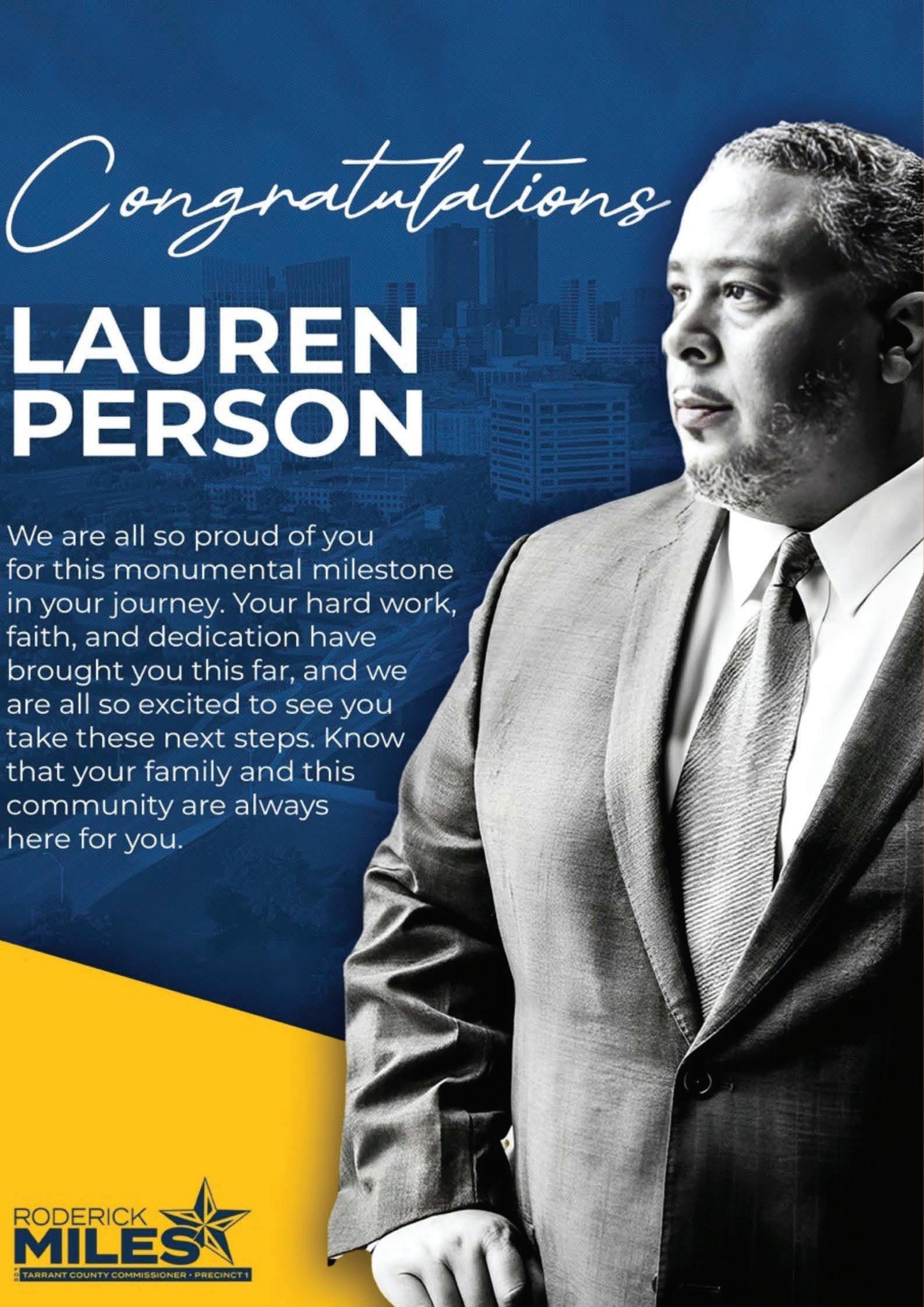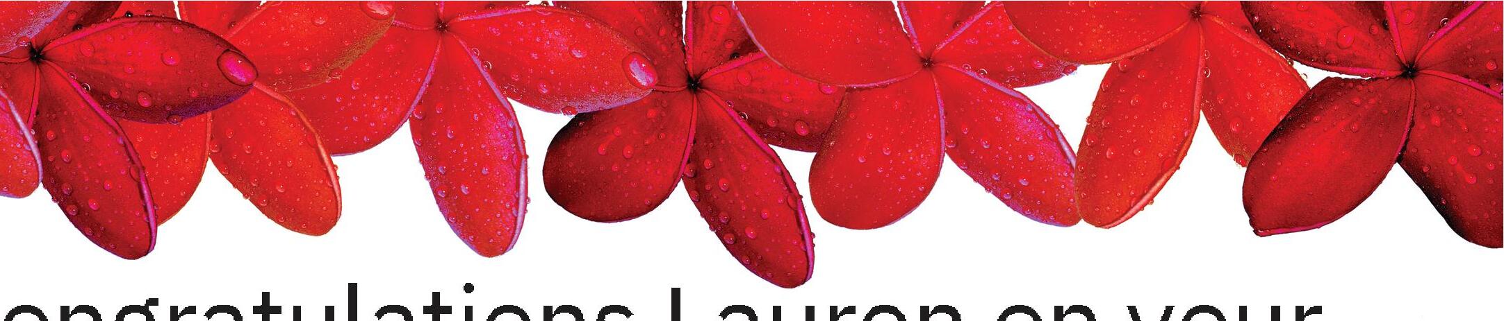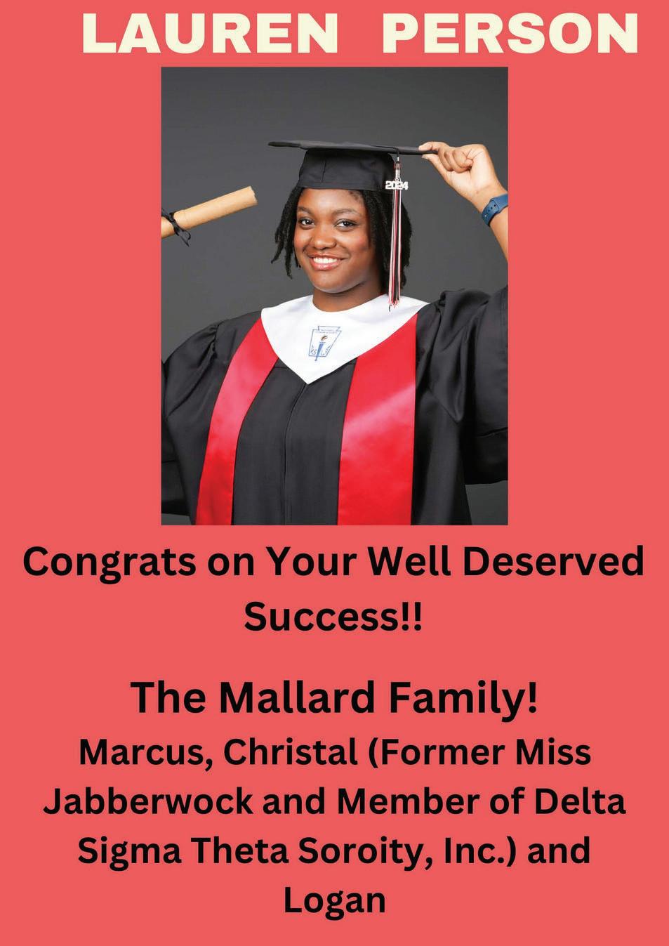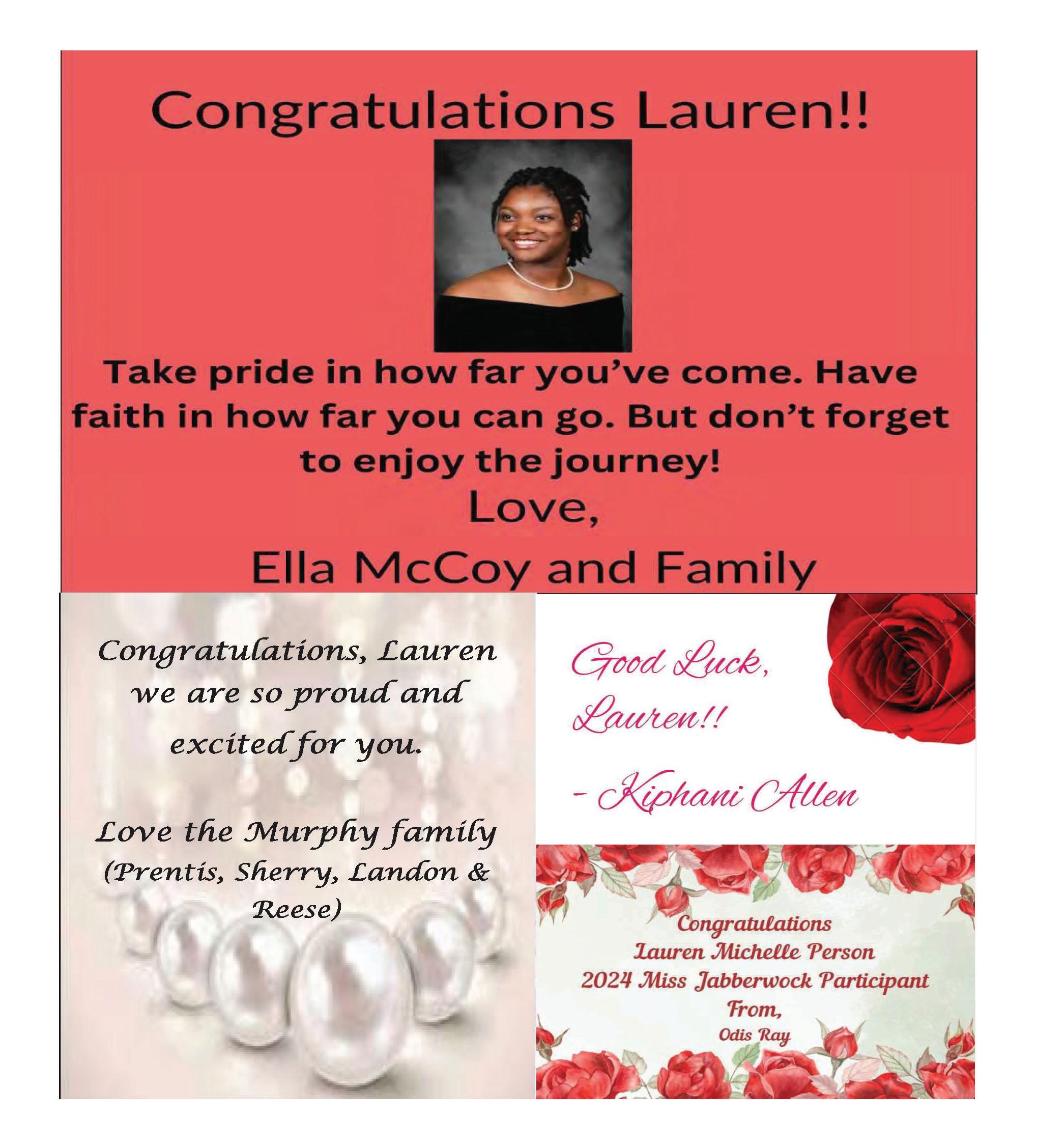 Lauren, Congratulations!Wearesoproudofyou!Graduationisnot theendofalongjourneybutthebeginningofabeautifulone. Starteachdaybelievinginyourself,andwatchthemagichappen! MayGod’sfavorfollowyoueverywhereyougo!