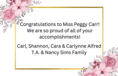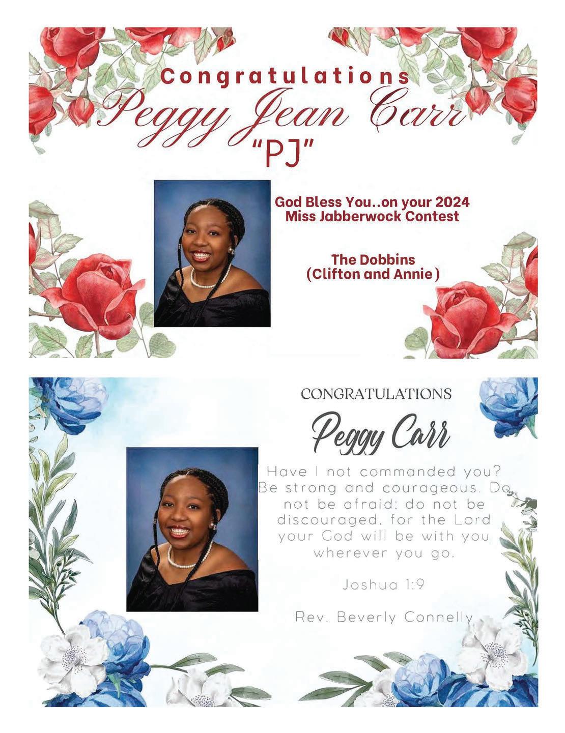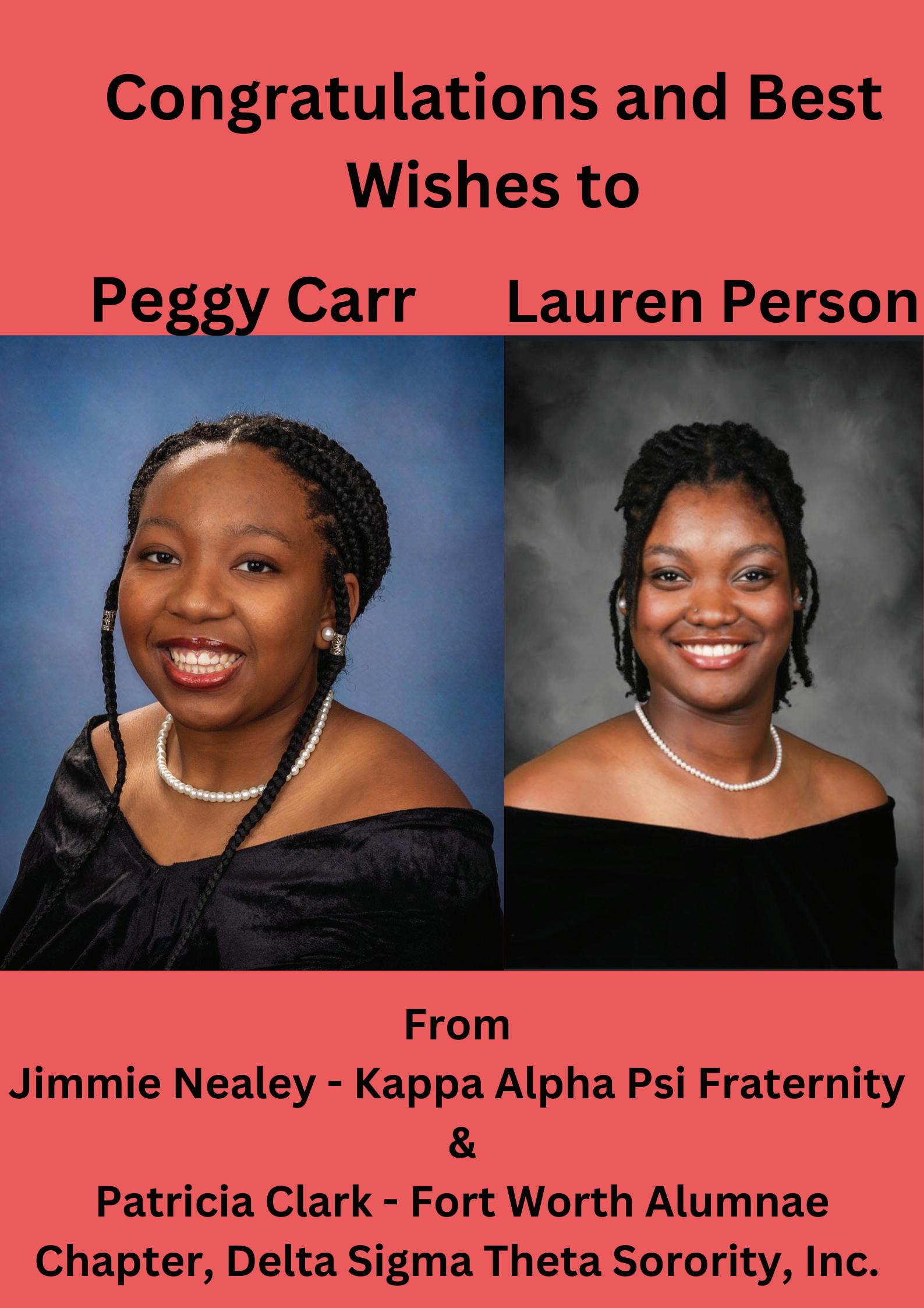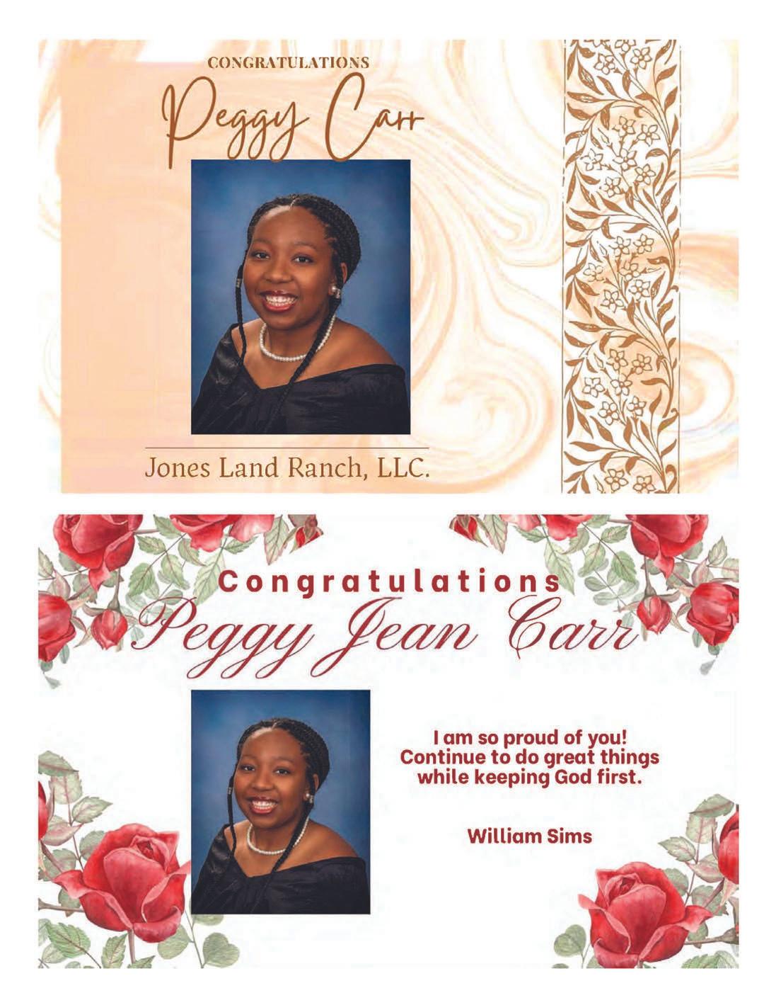 PeggyCarr isthedaughterofLouisandKenyailCarrofFortWorth,Texas.Asa seniorattheYoungWomen’sLeadership.Academy,Peggy isknownasa highly intelligentscholarandanathleticsuperstar.ShehasmaintainedstraightA’s throughoutherhighschoolcareer,excelling inmathwhereshesurpassedCalculus AB,thehighest-levelmathcourseofferedonhercampus.Peggy isa two-time statequalifierinTrackandFieldandwasthefirstathleteinthehistory ofYWLA toqualifyforUIL,placing5thinthediscusattheTexasStateTrackandField Competition.Shereceivedseveralscholastichonorsincluding therecipientofthe APScholarAward,andtheCollegeBoardNationalAfricanAmerican Recognition,andwasaWFAAScholar-AthleteoftheWeek.Shewasalsoan InterAstraSpaceNationalConferenceFinalist.Peggy isamemberofthe NationalHonorSocietyandtheNational Spanish Honor Society.