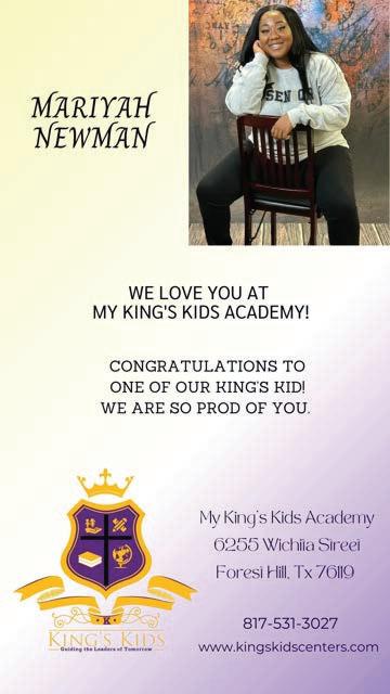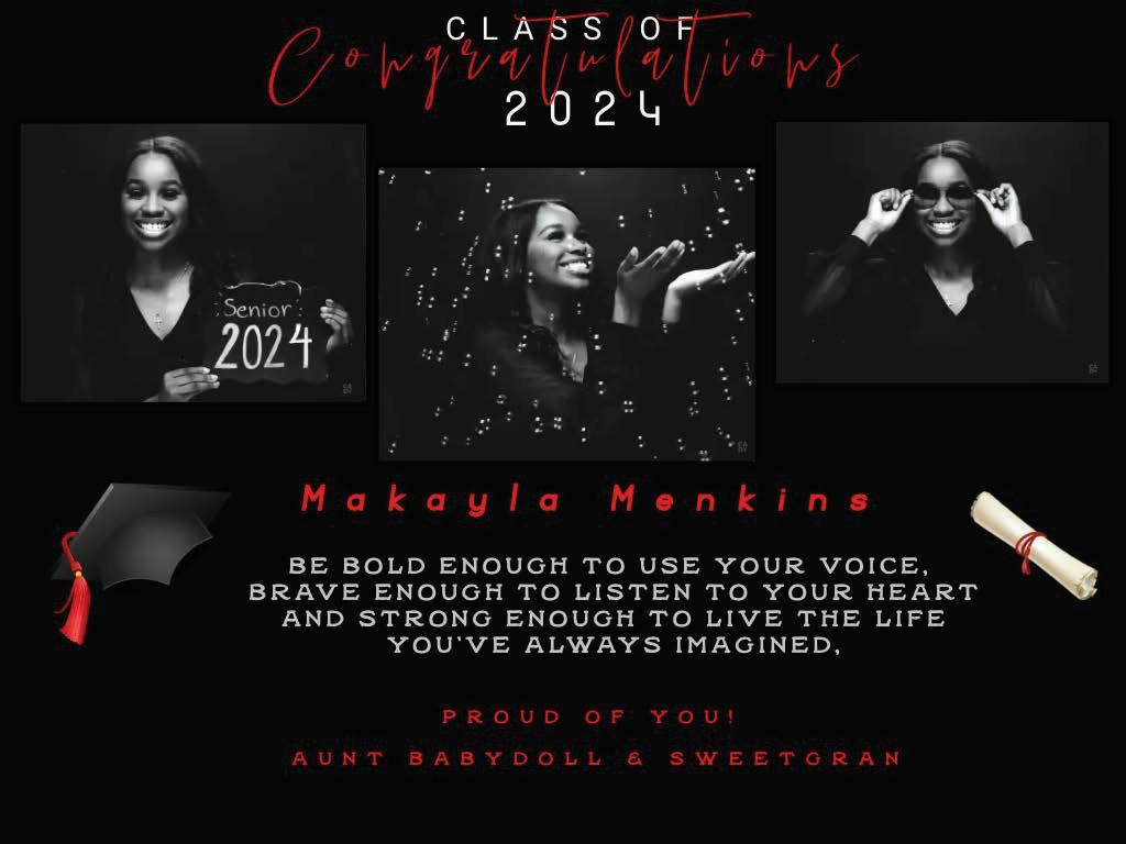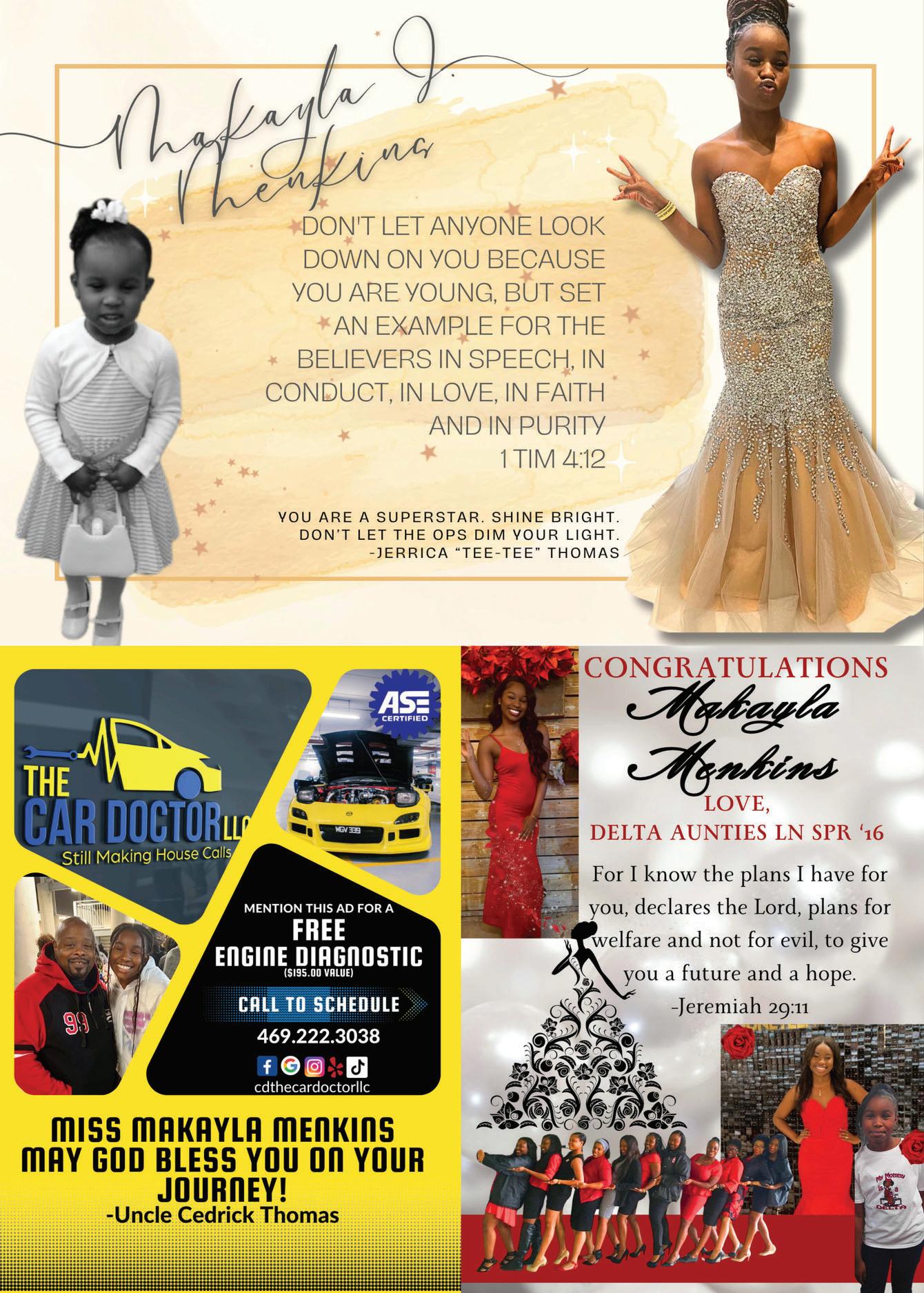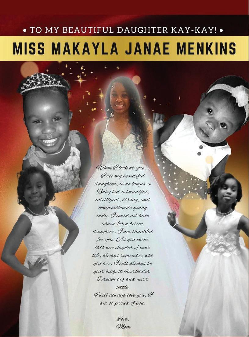 MakaylaMenkis isthedaughterofJessicaJohnsonofFortWorth, TX.AttendingNorthCrowleyHighSchoolinCrowley,TX,sheis notonlyonthe A&BHonorRoll,butamemberoftheNational HonorSocietyaswell.Makaylaisaprimeexampleof“GirlsRule theWorld”.Whilemaintainingherhighacademicstandards,sheis theVarsityCheerleadercaptainandamemberoftheStudent CouncilandtheBlackStudentUnion.