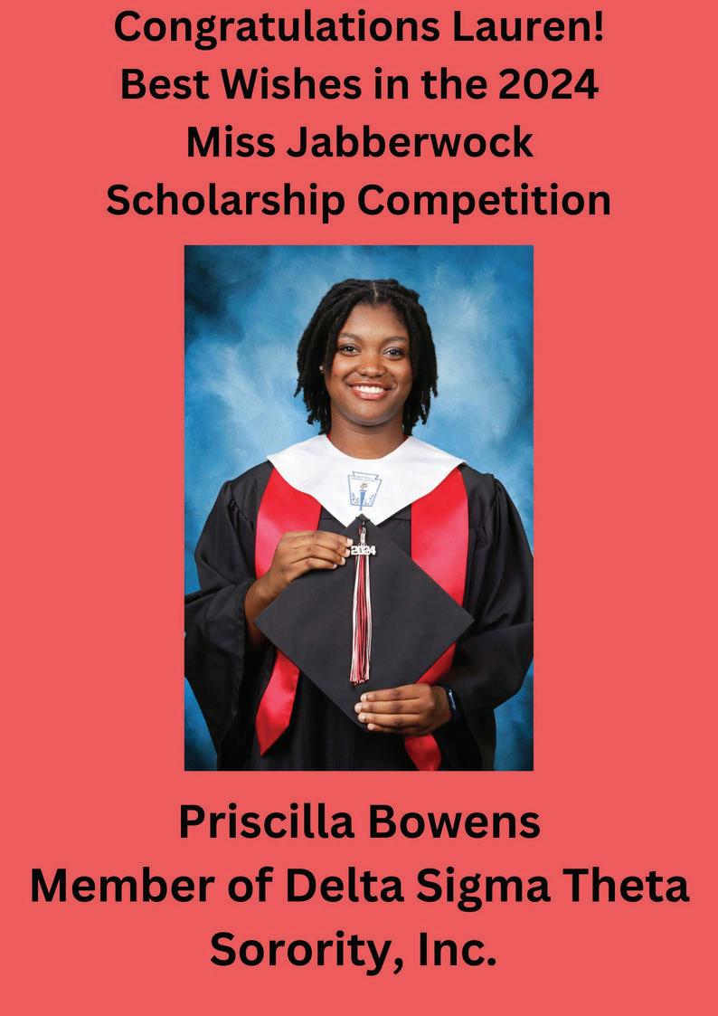 LtoR:MissJabberwock2024,LaurenPersonreceives thereceivesthe$1500BREADScholarship,awarded byBREADPresident,BarbaraCager,nexttoChair, JordanStinnett