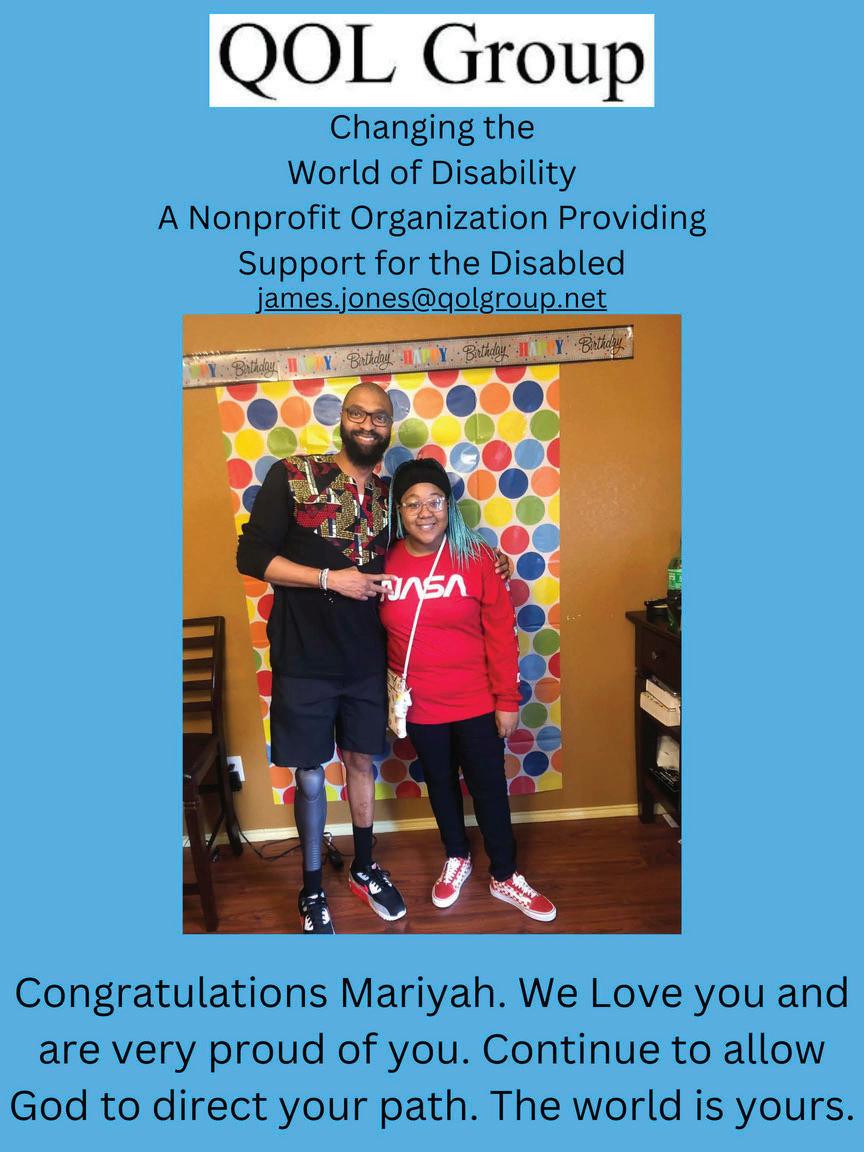 MariyahplanstoattendHouston-TillotsonUniversityinAustin, TexasmajoringinBiologyandChemistry.Hercareergoalisto becomeaMarineBiologist.MariyahhasalsocommittedtoHTU’s Volleyballprogram.