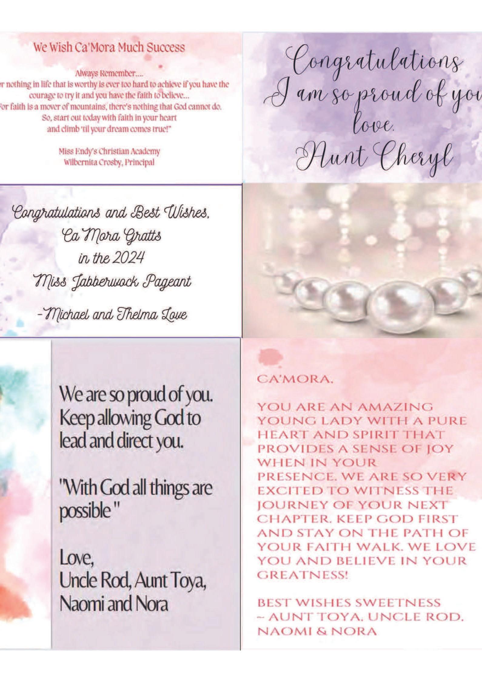 Ca’MoraisemployedatMariachi’sDine-Inwheresheserveswithaheartofgratitudeandkindness. SheattendsGreaterRisingStarMissionaryBaptistChurchwhereFloydBrooksisthepastor.Ather placeofworship,Ca’MoraservesontheJr.UsherBoard,S.E.AdkinsYouthChoir,Daughterof PraiseDanceMinistry,andworksasaSoundRoomTechnician.Ca’Morabalancesschool,extracurricularactivities,work,andcommunityserviceallwhilespendingtimewithfamilyandfriends, playingtheviolin,reading,anddrawing.