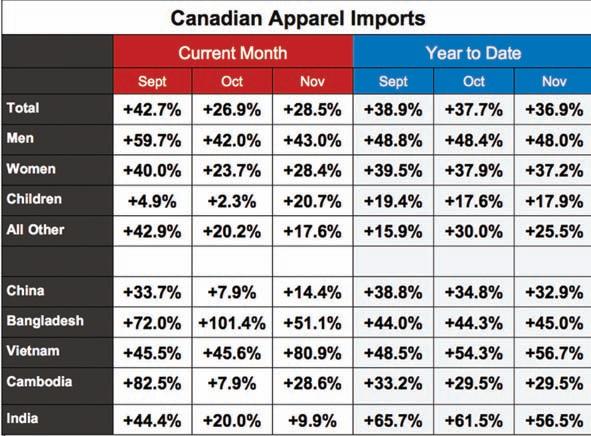 Canadian retailers demand for foreign made apparel continued to remain strong during the rst eleven months of 2022 as they increased in dollar terms by 36.9%. The increase was in large part due to China (+32.9%), Vietnam (+56.7%), Bangladesh (+45.0%), India (+56.5%), Italy (+29.2%) and Indonesia (+47.6%). Imports from the U.S. increased (+16.9%).