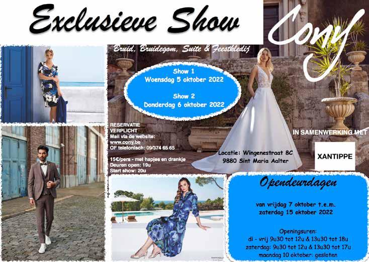 Verantwoordelijke uitgever: BLS Media, Vrijheid 8, 2320 Hoogstraten. Openzondag 2 oktober van 10 Ouwegemsesteenweg 175 • Kruisem (Ouwegem) • 09/384 16 59 www.vermeirenschoenen.be di - vr : 9.30 - 12u / 13.30 - 18u • zat : tot 17u SNEAKER Xsensible BOOTS Semler SCHOEN Miz Mooz Vrijdag 30 september & zaterdag 1 oktober bloemetje voor elke klant Dames- & herenschoenen in diverse wijdtes/voor steunzolen Pantoffels Handtassen in leder MAGDA VERMEIREN Totale uitverkoop Van Gils Kostuums, vesten, hemden, pulls Volg ons op instagram en facebook Social Media Nazarethsesteenweg 65 | KRUISEM 09/383 56 77 Dinsdag tot vrijdag 9u-12u en 13u30-18u30 Zaterdag 9u-12u en 13u30-18u Zondag 9u-12u Gesloten op maandag en feestdagen We blijven bereikbaar tijdens de wegenwerken! Meer info op www.texandrea.be -10% directe korting en een leuke attentie! (niet cumuleerbaar met andere kortingen)