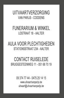 3 Openingsuren: maandag 13u30 - 18u30, dinsdag - vrijdag: 9u30 - 12u en 13u30 - 18u30 zaterdag: 9u30 - 12u en 13u30 - 18u, zondag en maandagvoormiddag gesloten Bij aankoop €150 1 per klant zolang de voorraad strekt GRATIS geurkaars 8 oktober NATIONAL XANDRES DAY Zondag 9 oktober van 9u30 tot 12u EXTRA OPEN Boomgaard 2/0A Aalter 09/374.05.45 - boetiek.liliane@telenet.be - www.boetiek-liliane.be Opendeurdagen VAN 30 SEPTEMBER TOT EN MET 29 OKTOBER 2022 -10% DIRECTE KORTING Spar wijnweken Knalpromo’s van 6 oktober t/m 2 november! 2+1 GRATIS*** KIES & MIX 2+1 gratis 2+1 GRATIS*** KIES & MIX 2+1 gratis met je XTRA-app of -kaartSpar-kortingen Lostraat 44 • 9880 AALTER • www.verssupermarktvanlaecke.be OPENINGSUREN: maandag 13.30 - 19.00u, dinsdag t.e.m. vrijdag 08.30 - 19.00u, zaterdag 08.00 - 18.00u, zondag 08.00 - 12.00u 2+1 GRATIS*** KIES & MIX *** 33,33% korting bij Ons NU OOK TE VERKRIJGEN: everzwijn struisvogel Open elke vrijdag en zaterdag van 10 tot 18u Hertenfarm Sergeant G. Biebuyckstraat 25 - 9850 Nevele - 0496/86.35.15 of 09/371.82.79 hertenfarm.sergeant@telenet.be Online bestellen: www.hertenvlees-sergeant.be NU PROMO proefpakket 5 kg voor € 109 euro Hert: €10/kg karkas+versnijding Kostuums, jacquetsen smokings VERHUUR Openingsuren: Di tot Vr van 9u30 tot 12u en van 13u30 tot 18u. Zat van 9u30 tot 12u en van 13u30 tot 17u. zondag en maandag gesloten Wingenestraat 8C - Maria Aalter 09/374 65 65 - www.cony.be