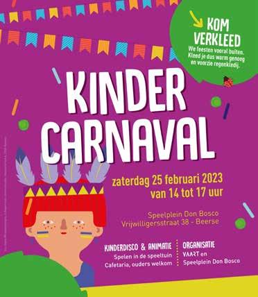 zaterdag 25 februari 2023 – 14 tot 17 uur Op zaterdag 25 februari ben je welkom op Speelplein Don Bosco voor een heus kindercarnaval. Kom mee spelen, vieren en shaken op de tunes van de kinderdisco. Trommel je vriendjes op, trek je leukste verkleedkleren aan, dan wordt het gegarandeerd een onvergetelijke namiddag!