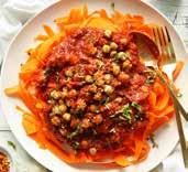 Worteltagliatelle met kikkererwtenbolognese: Giet 400 g kikkererwten af en meng er 1 el olijfolie, een tl oregano, een snuifje zout, een snuifje lookpoeder, 3 el paneermeel en 1 el Parmezaan onder. Verdeel dit in één laag over een bakplaat en plaats die 20 minuten in een voorverwarmde oven van 190°. Snij intussen 1 wortel in kleine blokjes. Stoof die 3 minuten aan in 1 el olijfolie, samen met 3 geplette knoflookteentjes. Voeg 400 g gezeefde tomaten, 1 tl oregano en 1 el Parmezaan toe. Laat dit een kwartier pruttelen. Eventueel op smaak brengen met zout en suiker. Schil 9 grote wortelen en snij ze met een dunschiller in lange slierten. Leg ze 2 tot 3 minuten in kokend water en giet ze af. Meng ¾ van het kikkererwtenmengsel onder de tomatensaus. Schep die op de wortelsliertjes en werk af met de resterende kikkererwten en fijngesneden basilicum.