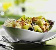 IJsbergsla met druiven en Cambozola: Meng 4 el appelazijn, 1 el mosterd, 1 el honing, 4 el room, 4 el olijfolie, peper en zout goed onder elkaar. Snij 200 g Cambozola in blokjes. Scheur een gekuiste ijsbergsla in hapklare stukken. Halveer 150 g witte pitloze druiven, en evenveel blauwe. Schil een peer en snij ze in schij es. Meng de kaas, de ui, de druiven en de peer onder de sla, samen met de dressing. Strooi er geplette roze peperbolletjes, grof gehakte walnoten en ringetjes van rode ui over.