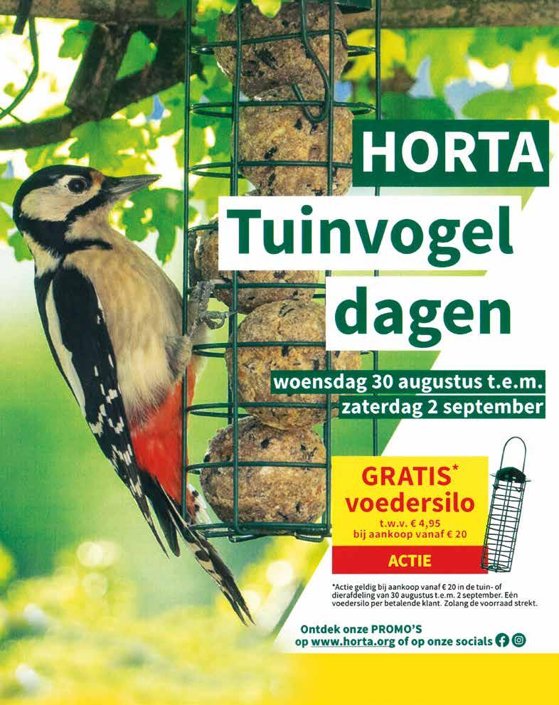 5 HORTA Meer • DeVo Meerseweg 26 • 2321 Meer Tel 03 315 75 53 • meer@horta.org HORTA Westmalle • Jacobin Antwerpsesteenweg 383 • 2390 Westmalle Tel 03 312 04 36 • westmalle@horta.org www.horta.org HORTA woensdag 15 maart t.e.m. zaterdag 18 maart Kippen dagen Ontdek onze PROMO’S op www.horta.org ONTDEK VERSCHILLENDE kippenrassen tijdens onze EXPO in de winkel Kies je favoriete kip en neem ze mee of bestel ze in de winkel 10% korting alle kippenaccessoires Ontdek al onze KIPPENSOORTEN! HORTA Westmalle • Jacobin Antwerpsesteenweg 383 • 2390 Westmalle Tel 03 312 04 36 • westmalle@horta.org HORTA Meer • DeVo Meerseweg 26 • 2321 Meer Tel 03 315 75 53 • meer@horta.org HORTA Westmalle • Jacobin Antwerpsesteenweg 383 • 2390 Westmalle Tel 03 312 04 36 • westmalle@horta.org www.horta.org HORTA woensdag 15 maart t.e.m. zaterdag 18 maart Kippen dagen Ontdek onze PROMO’S op www.horta.org ONTDEK VERSCHILLENDE kippenrassen tijdens onze EXPO in de winkel Kies je favoriete kip en neem ze mee of bestel ze in de winkel 10% korting alle kippenaccessoires Ontdek al onze KIPPENSOORTEN! HORTA Tuinvogel dagen woensdag 30 augustus t.e.m. zaterdag 2 september GRATIS* voedersilo t.w.v. € 4,95 bij aankoop vanaf € 20 ACTIE * Actie geldig bij aankoop vanaf € 20 in de tuin- of dierafdeling van 30 augustus t.e.m. 2 september. Eén voedersilo per betalende klant. Zolang de voorraad strekt. Al dat lekkers tuinvogels