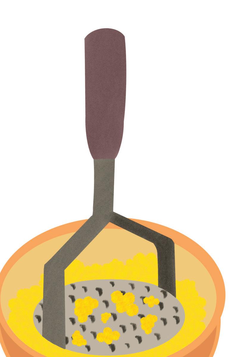 After cooking, drain the potatoes and place them in a mixing dish. Mash the potatoes with a potato masher or a fork to achieve a smooth consistency. Toss the mashed potatoes with the sautéed onions and 200 grams of cheese.