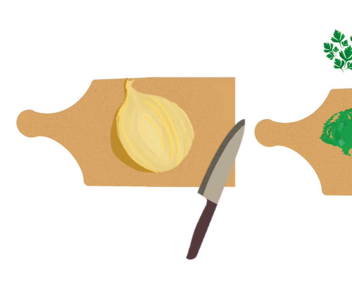 While the potatoes are boiling, heat a skillet over medium heat. Finely chop 2 medium onions. Add a small amount of 50 g butter to the skillet. Add the chopped onion and sauté until translucent and lightly golden brown, stirring occasionally, for 5-7 minutes.