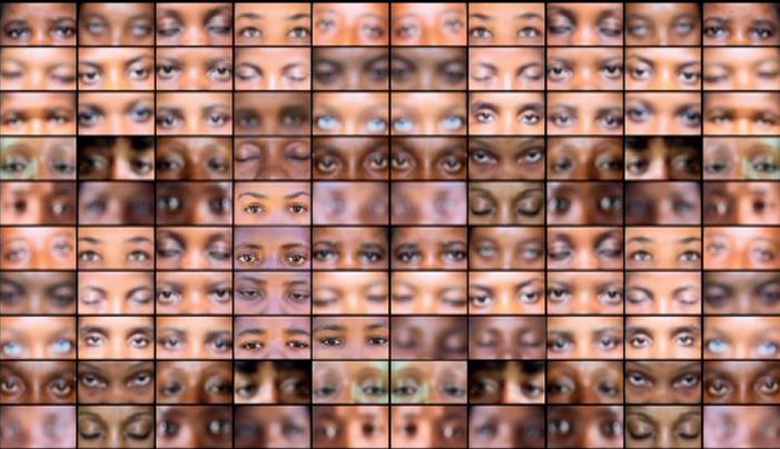 Videoinstalação produzida por Zanele Muholi em que uma centena de pares de olhos encaram o espectador.