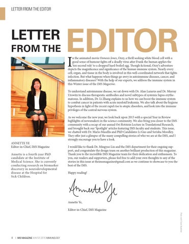 EDITOR I n the animated movie Osmosis Jones, Ozzy, a thrill seeking white blood cell with a good sense of humour fights off a deadly virus after Frank the human applies the ‘ten second rule’ to a dropped hard-boiled egg. Though fictional, Ozzy’s adventure depicts the magnificence and significance of the human immune system. Nearly every cell, organ, and tissue in the body is involved in this well-coordinated network that fights infection. But what happens when things go awry in autoimmune diseases, cancer, and inflammatory diseases? With the help of our experts, we address the immune system in this Winter issue of the IMS Magazine.