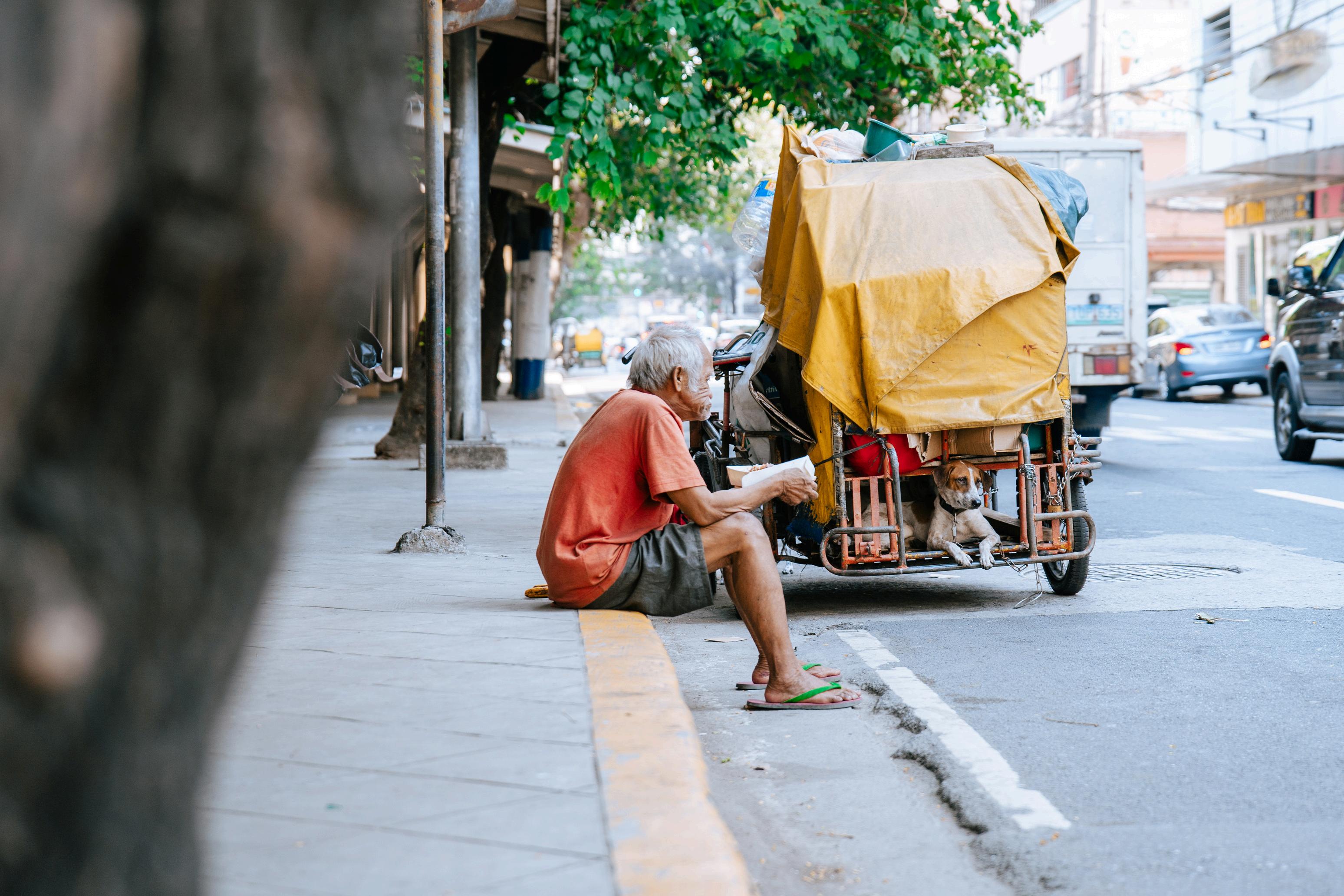 An elderly man sits with his meager meal, his loyal dog tucked into the tricycle beside him. Together they embody both vulnerability and dignity — depending on charity, yet offering each other comfort. The scene reminds us that public health challenges extend beyond individuals, touching the bonds that keep them alive.
