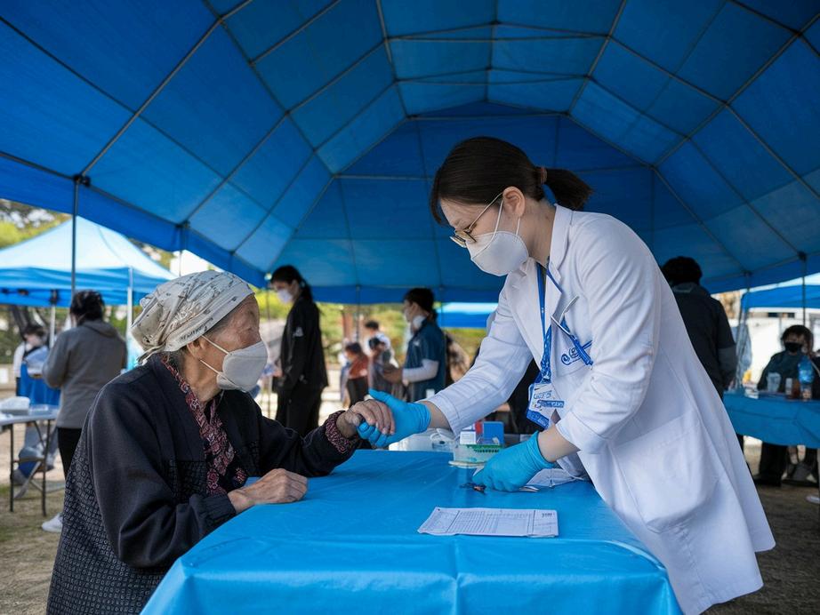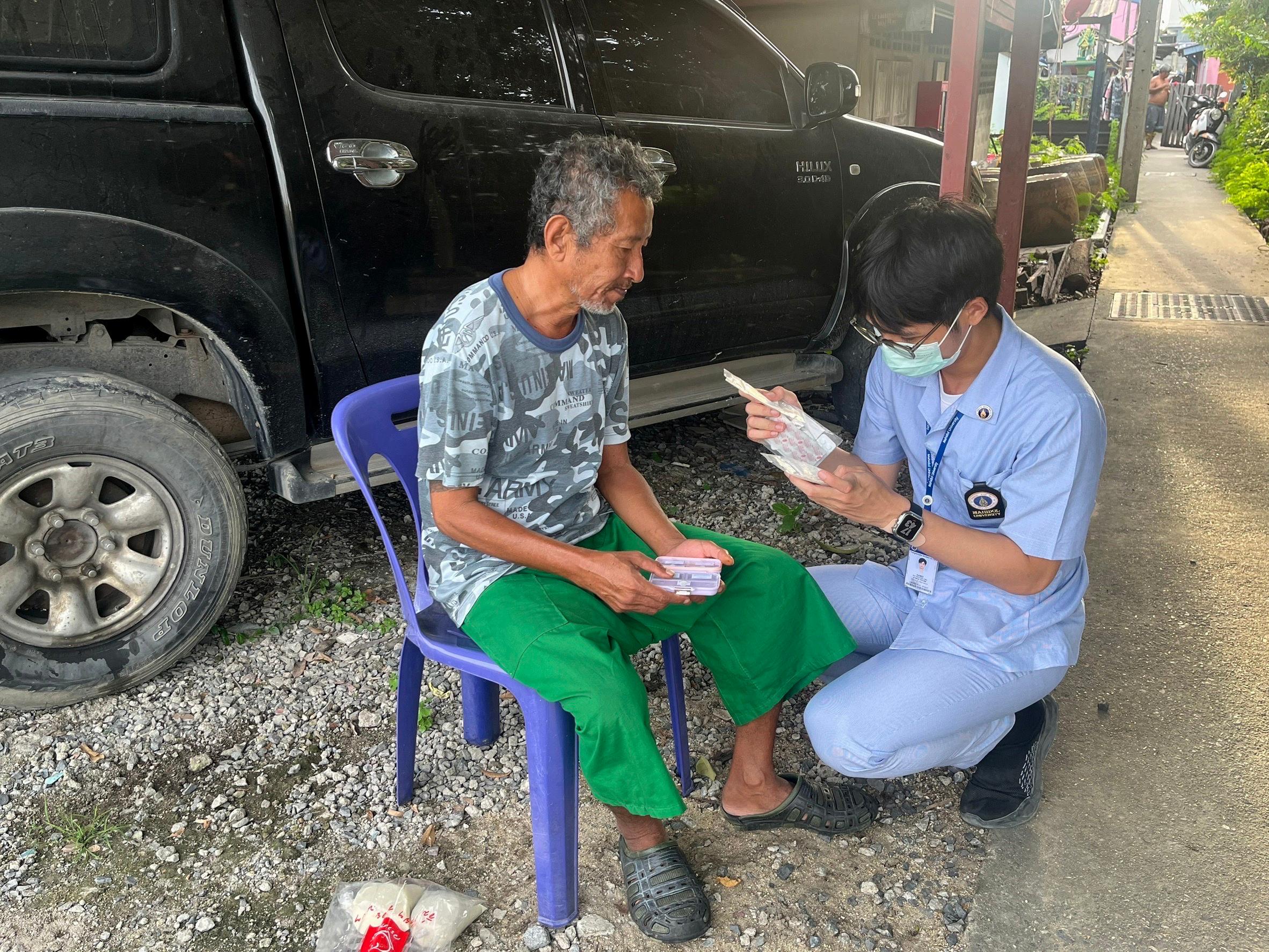 A community nurse practitioner kneels next to an aging patient seated in a plastic chair on a narrow gravel path. The young nurse is doing community service as part of his training. He takes a bunch of medicines out of a box and puts them into a clear pill organizer, explaining each dose and when it should be taken. The patient pays great attention while holding the newly organized medicines that would help him recall his routine. This kind of scene shows where public health is most needed: at home. Instead of a clinic, care is given on a driveway that is shaded by a parked vehicle and fits into the everyday routine. The nurse makes people feel more sure about taking their medicines by breaking them down and explaining how to take them. In a world that is always changing and where chronic sickness and complicated regimens can be too much to handle, these one-on-one meetings remind us that good healthcare starts with empathy, planning, and personal direction.