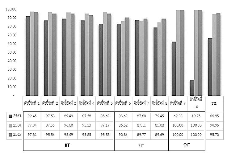 คะแนน ส่งผลให้ได้รับประกาศนียบัตรเชิดชูเกียรติจากสานักงาน ป.ป.ช การป้องกันการทุจริต ทั้งนี้ การรับรู้ของ ผู้มีส่วนได้เสียภายนอก (EIT) มีคะแนน เพิ่มขึ้นทุกตัวชี้วัด ในขณะที่การรับรู้ ของผู้มีส่วนได้เสียภายใน (IIT) ได้ คะแนนลดลงเล็กน้อยจากปีงบประมาณ พ.ศ. 2564 ทุกตัวชี้วัด เห็นควรพิจารณา แนวทางให้ได้รับคะแนนเพิ่มขึ้น ตัวชี้วัดที่ได้รับคะแนน 100.00 เช่นเดียวกับปีงบประมาณ พ.ศ. 2564 จานวน 2 ตัวชี้วัด คือ ตัวชี้วัดที่ 9 การเปิดเผยข้อมูล และ