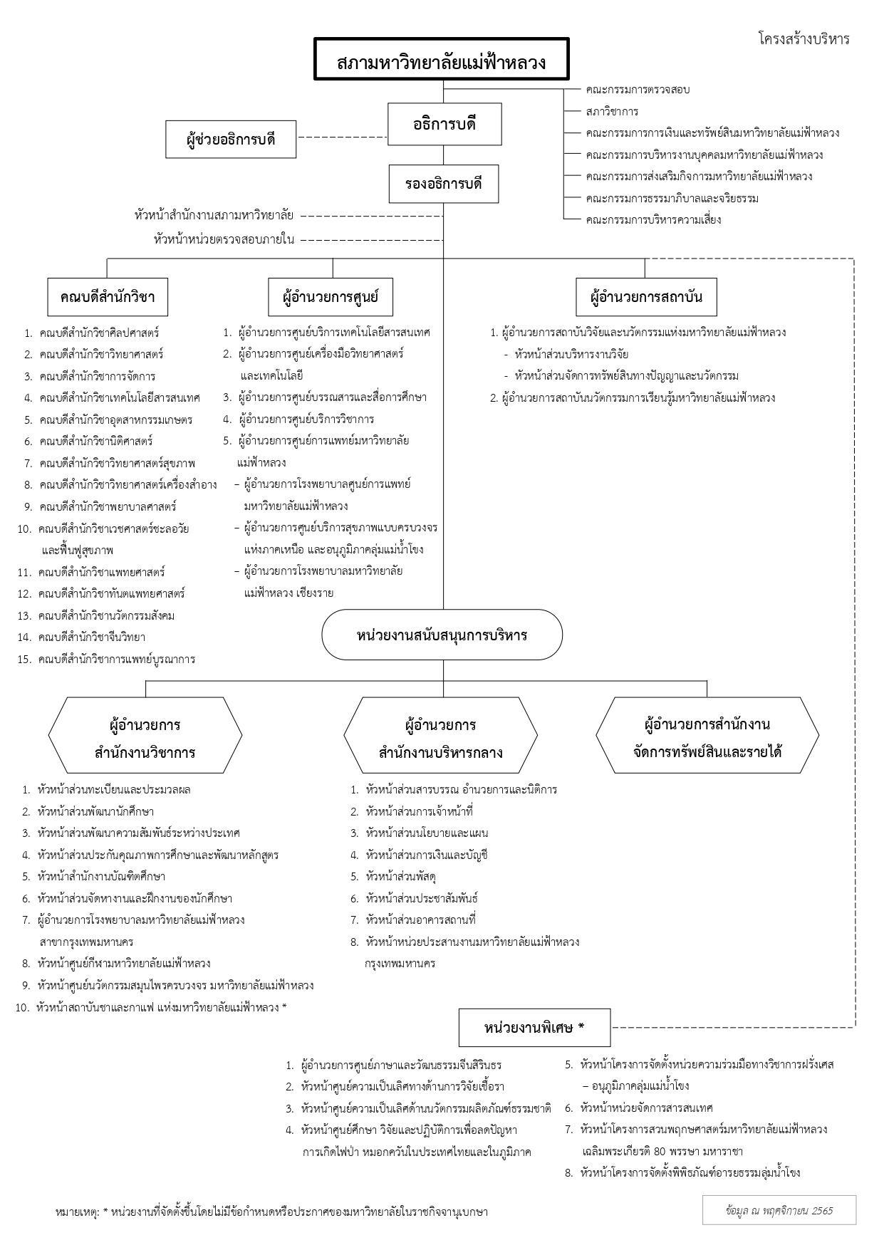 รายงานผลการดาเนินงานคณะกรรมการตรวจสอบ มหาวิทยาลัยแม่ฟ้าหลวง ปีงบประมาณ พ.ศ. 2565 93 ที่มาของข้อมูล 1. โครงสร้างองค์กร มหาวิทยาลัยแม่ฟ้าหลวง : ส่วนนโยบายและแผน 2. โครงสร้างบริหาร มหาวิทยาลัยแม่ฟ้าหลวง