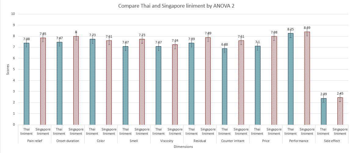 The second ANOVA test was employed to compare means of 10 aspects between Thai and Singapore liniment. The results were; pain relief, onset and duration, color, smell, viscosity, residual, counterirritant, performance and side effect were not significantly different (p≥0.05), however only the price of Thai liniment was significantly cheaper than Singapore liniment (p<0.05) (Table 2)