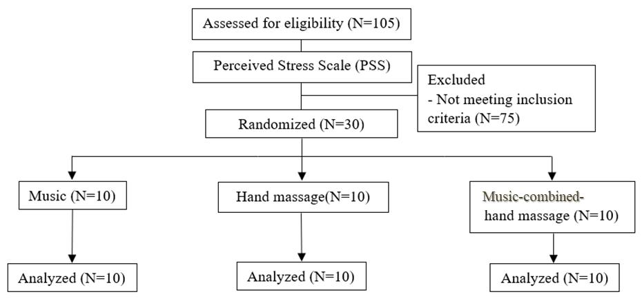 scale The collected data were analyzed using the Statistical Package for the Social Sciences (SPSS) version 17.0. Demographic characteristics were summarized using descriptive statistics. The nominal or ordinal scale variables were expressed in frequencies and percentages whereas the ratio scale results were presents in mean±standard deviation. parametric paired t-test was used to compare means before (treatment A-Thai liniment) and after (treatment B-Singapore liniment) of group A and to compare means before (treatment B-Singapore liniment) and after (treatment A-Thai liniment) of group B. Whereas, one way ANOVA was used to compare means of the two independent groups (A and B, 2 times) A p<0.05 was considered statistically significant in all directional (one-tailed) tests (Figure 1)